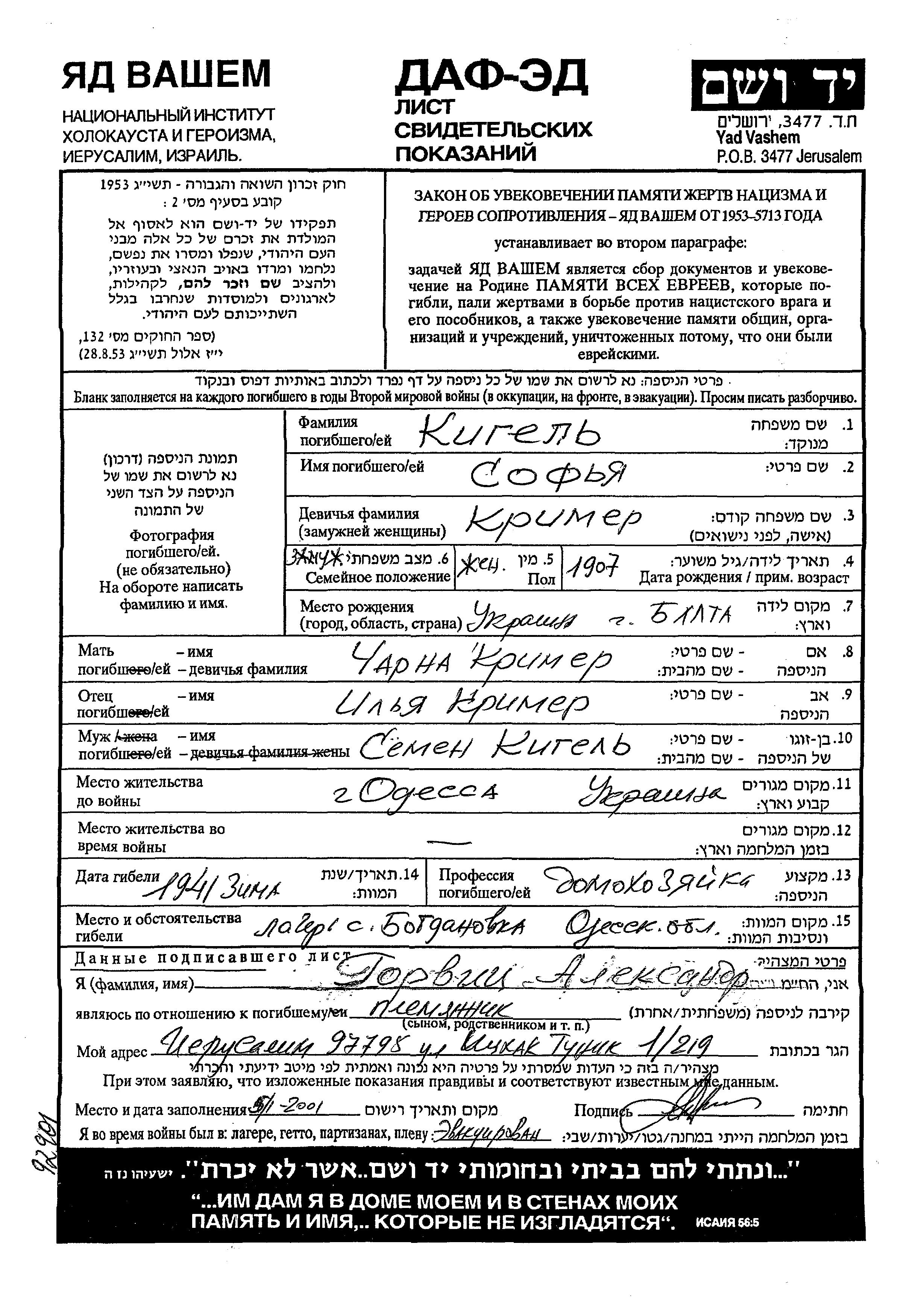 Kigel Sofya 1907 Odessa, Ukraine (USSR) Page of Testimony