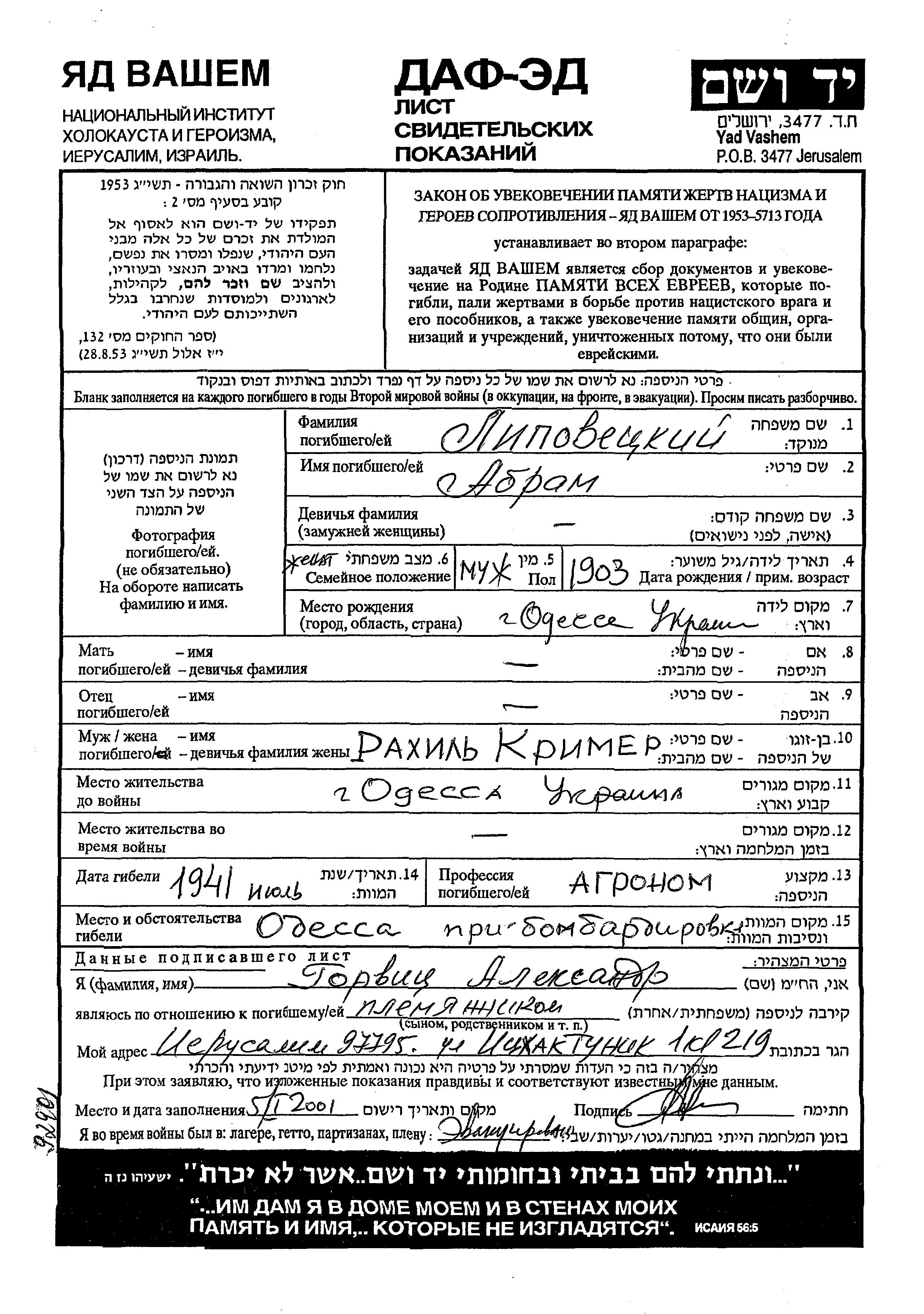 Abram Lipovetzki was born in Odessa, Ukraine (USSR), 1903. He was an agronomist and married to Rakhil. Prior to WWII he lived in Odessa, Ukraine (USSR). Abram was murdered in the Shoah. Place of death: Odessa, Ukraine (USSR), 1941.