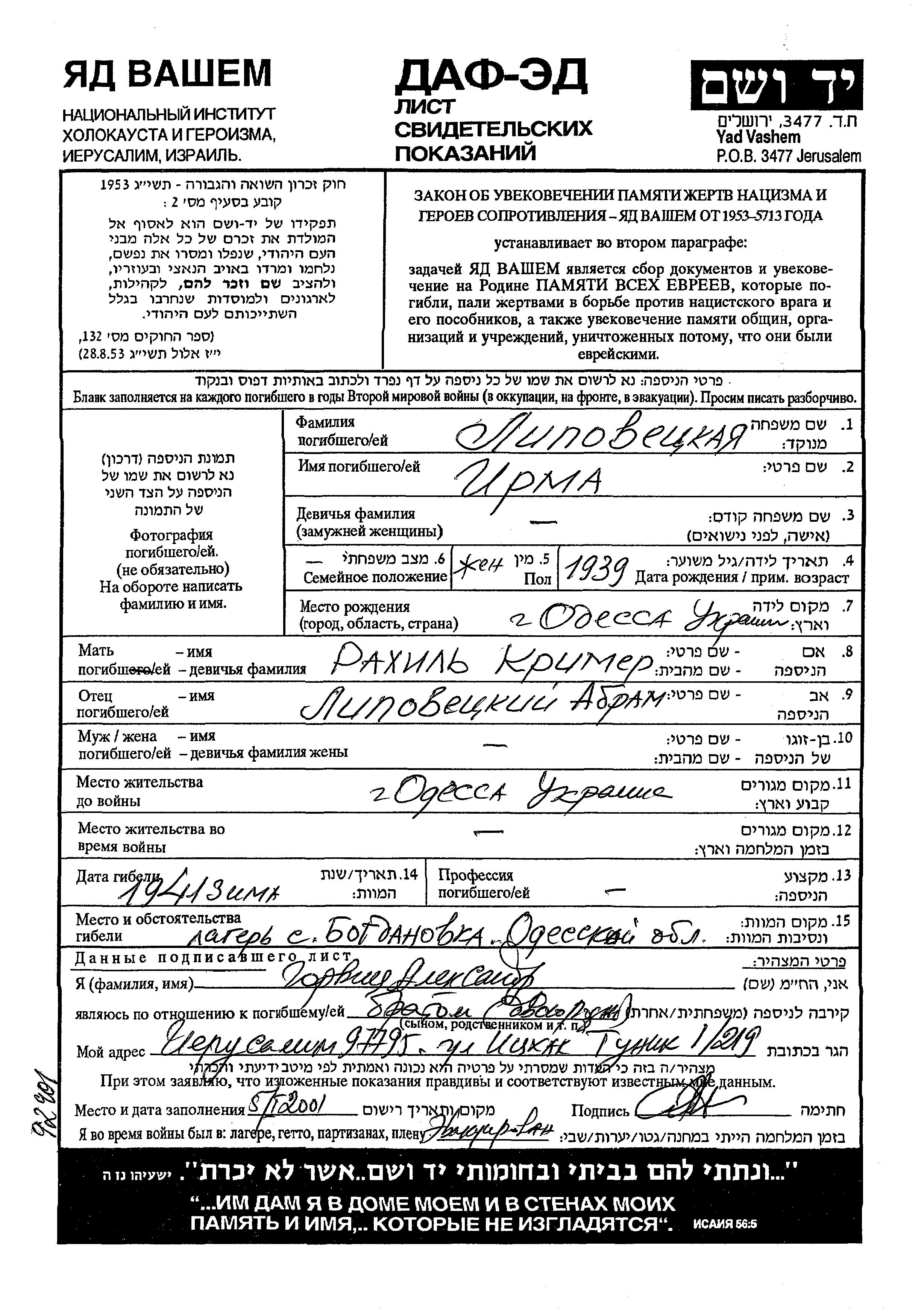 Irma Lipovetzkaya was born in Odessa, Ukraine (USSR), 1939 to Abram and Rakhil. She was child. Prior to WWII she lived in Odessa, Ukraine (USSR). Irma was murdered in the Shoah. Place of death: Bogdanovka, Ukraine (USSR), 1941.