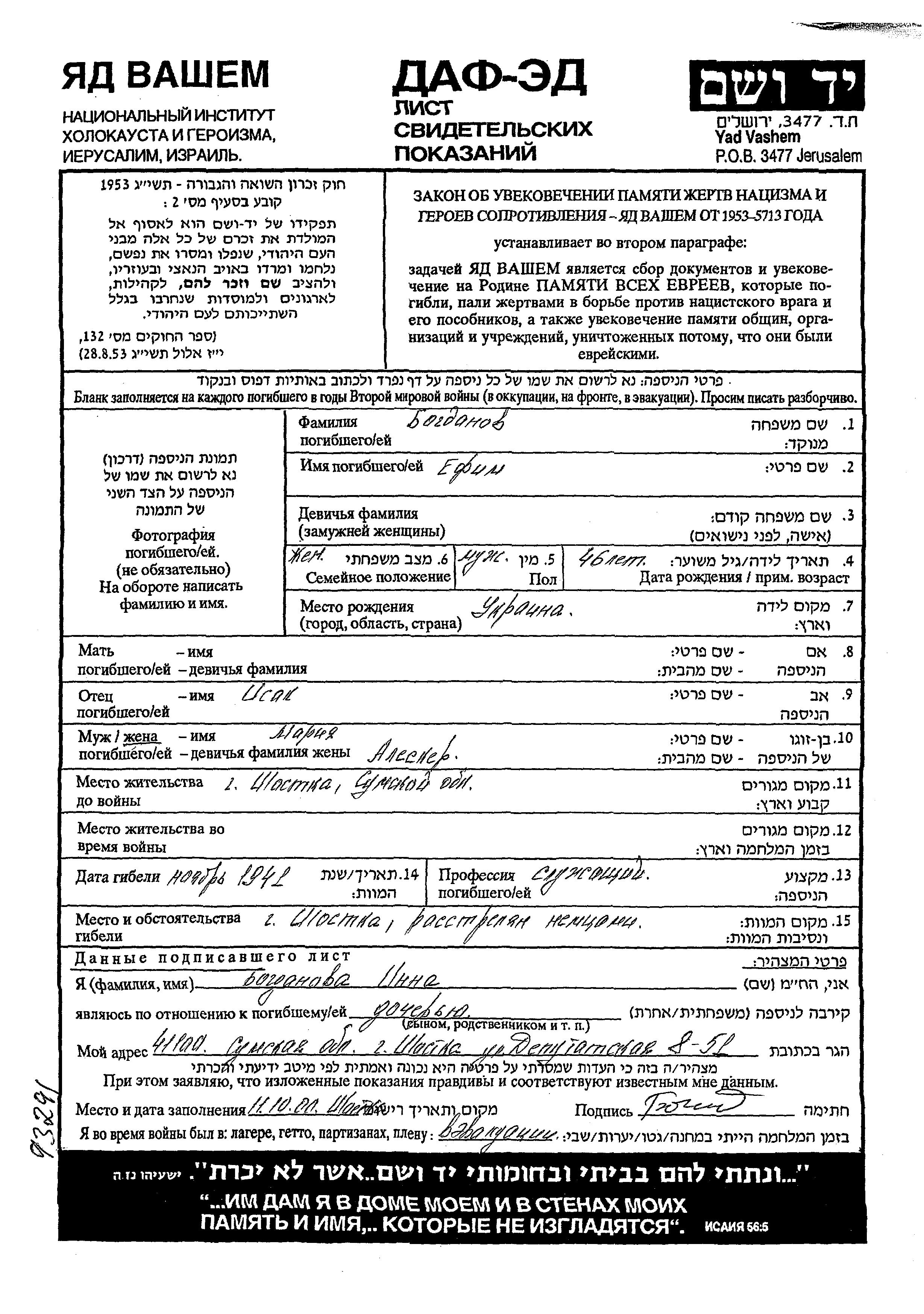 Yefim Bogdanov was born in Ukraine (USSR) to Isak. He was an employee and married to Maria. Prior to WWII he lived in Shostka, Ukraine (USSR). Yefim was murdered in the Shoah. Place of death: Shostka, Ukraine (USSR), 1941.