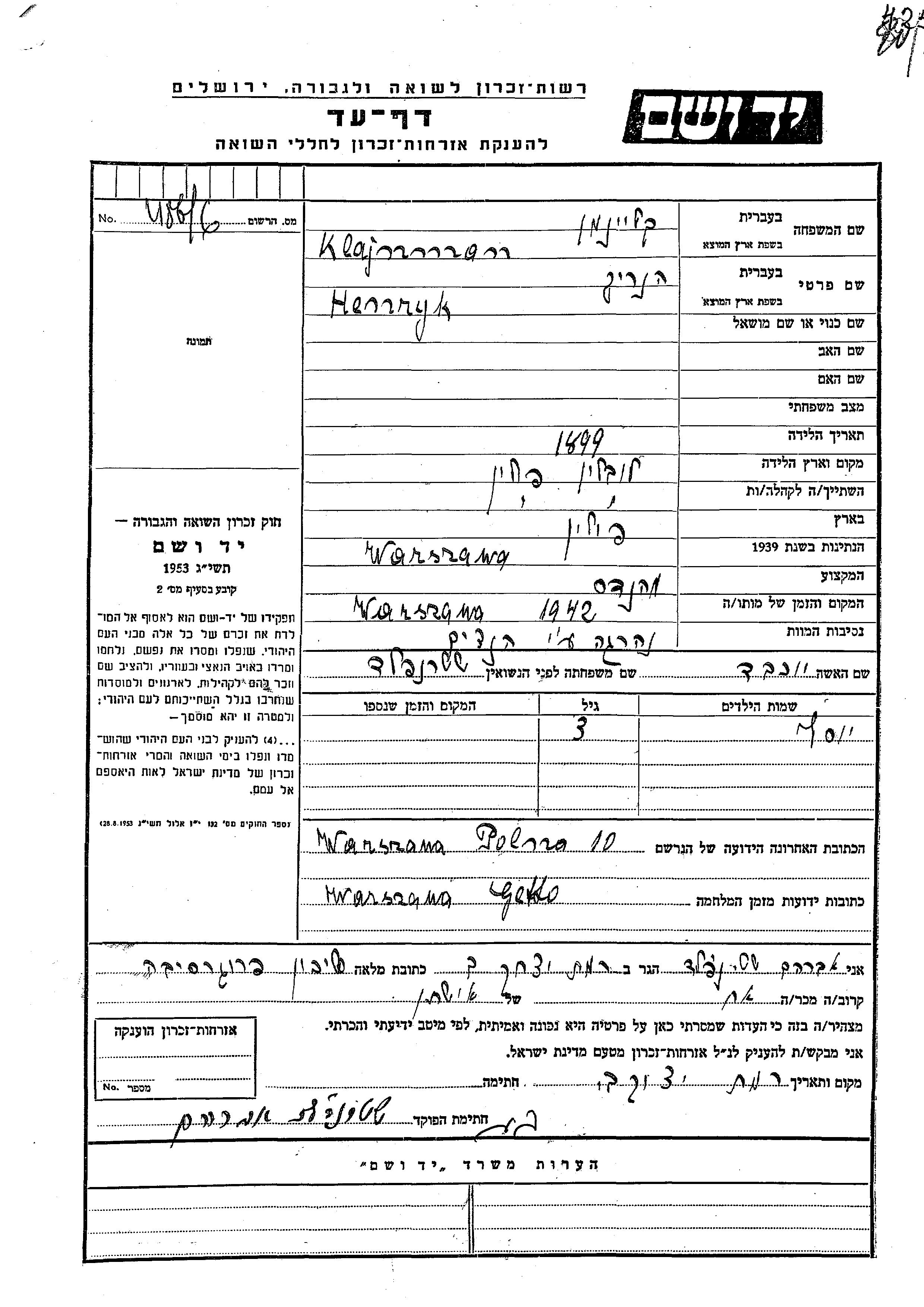 Klajnman Henryk 1899 Poland Page of Testimony