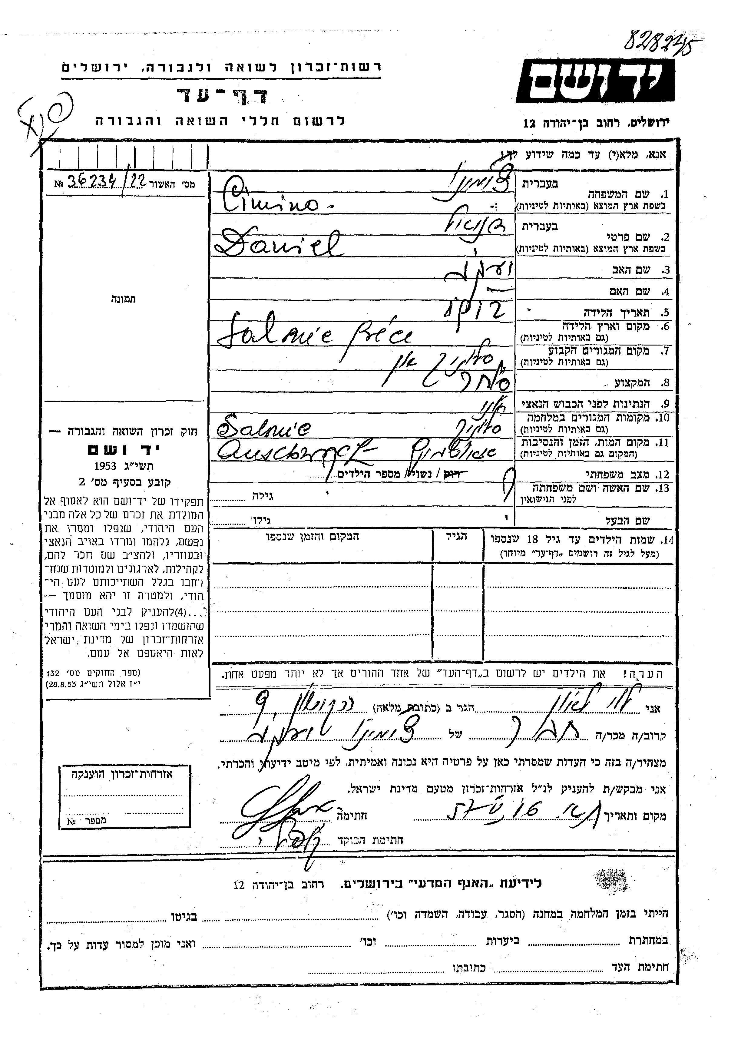 Cimino Daniel 1912 Saloniki, Greece Page of Testimony
