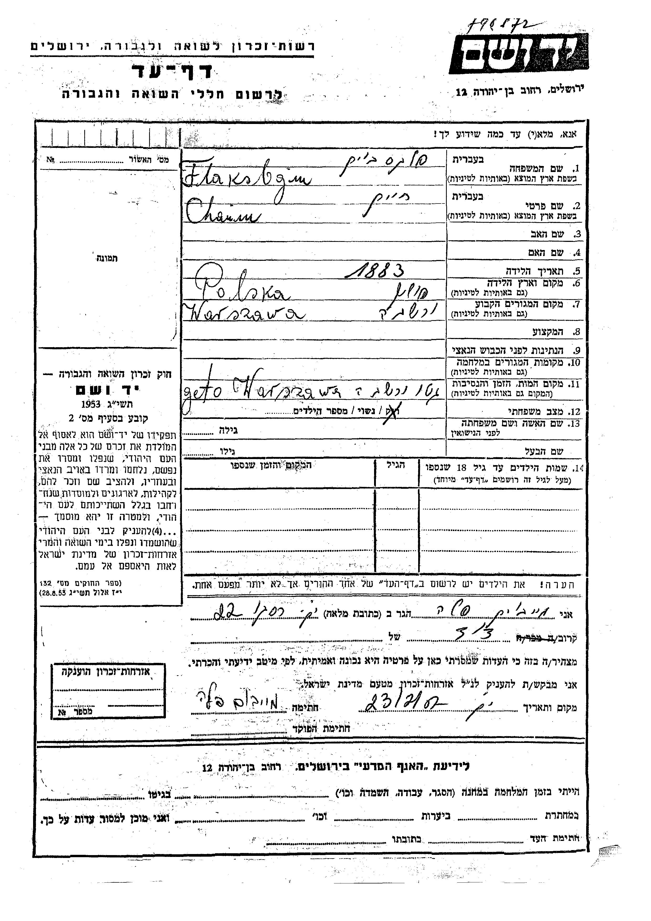 Flaksbojm Chaim 1883 Warszawa, Poland Page of Testimony