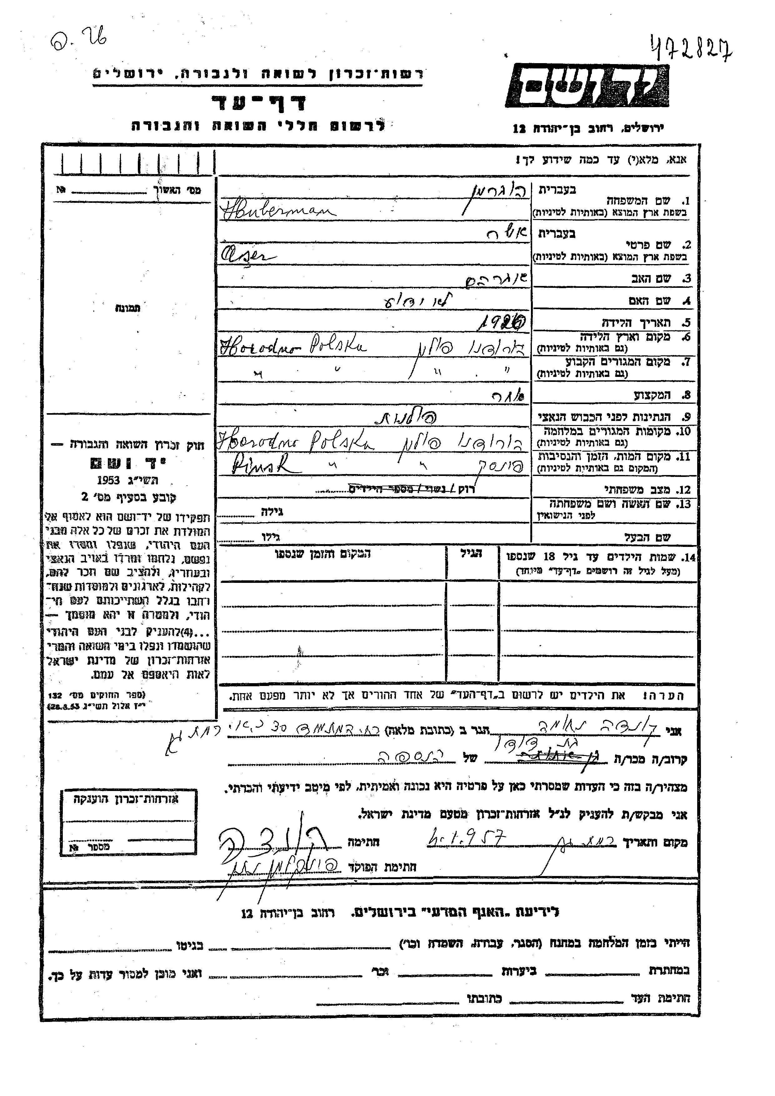 Aser Huberman was born in Horodno, Poland, 1920 to Avraham. He was a merchant and single. Prior to WWII he lived in Horodno, Poland. During the war he was in Horodno, Poland. Aser was murdered in the Shoah. Place of death: Pinsk, Poland.