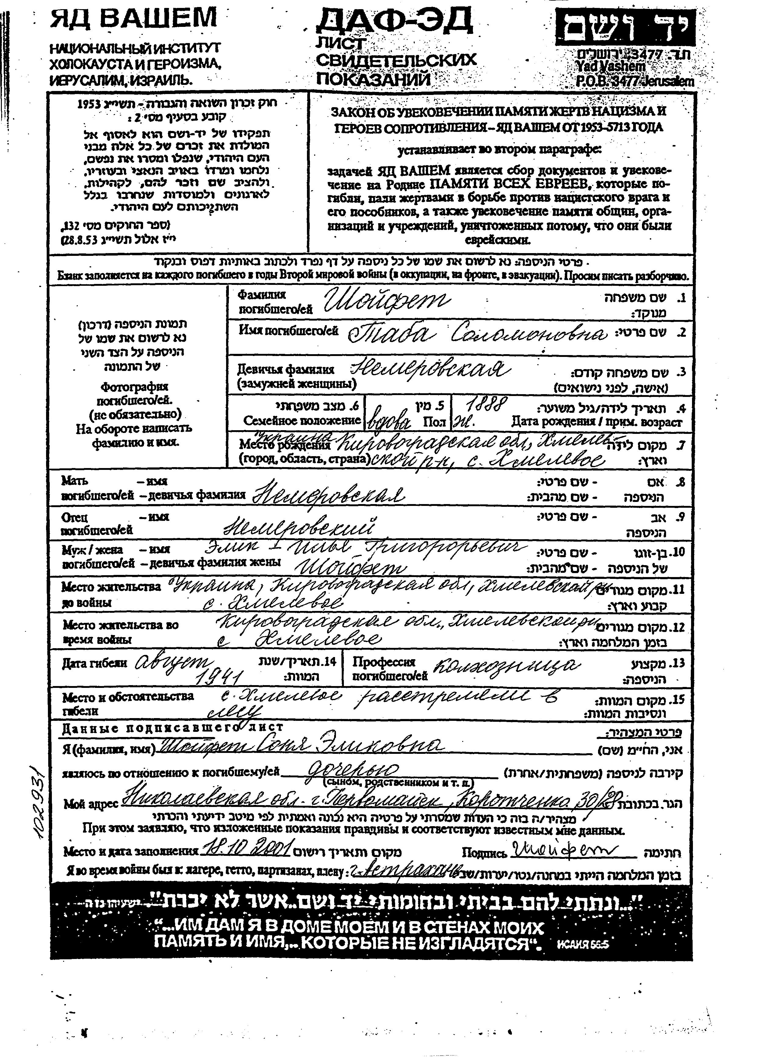 Taba Shoifet nee Nemerovskaya was born in Khmelevoye, Ukraine (USSR), 1888 to Solomon. She was a kolkhoznik / kolkhoznitza and a widow of Alik Ilya. Prior to WWII she lived in Khmelevoye, Ukraine (USSR). During the war she was in Khmelevoye, Ukraine (USSR). Taba was murdered in the Shoah. Place of death: Khmelevoye, Ukraine (USSR), 1941.