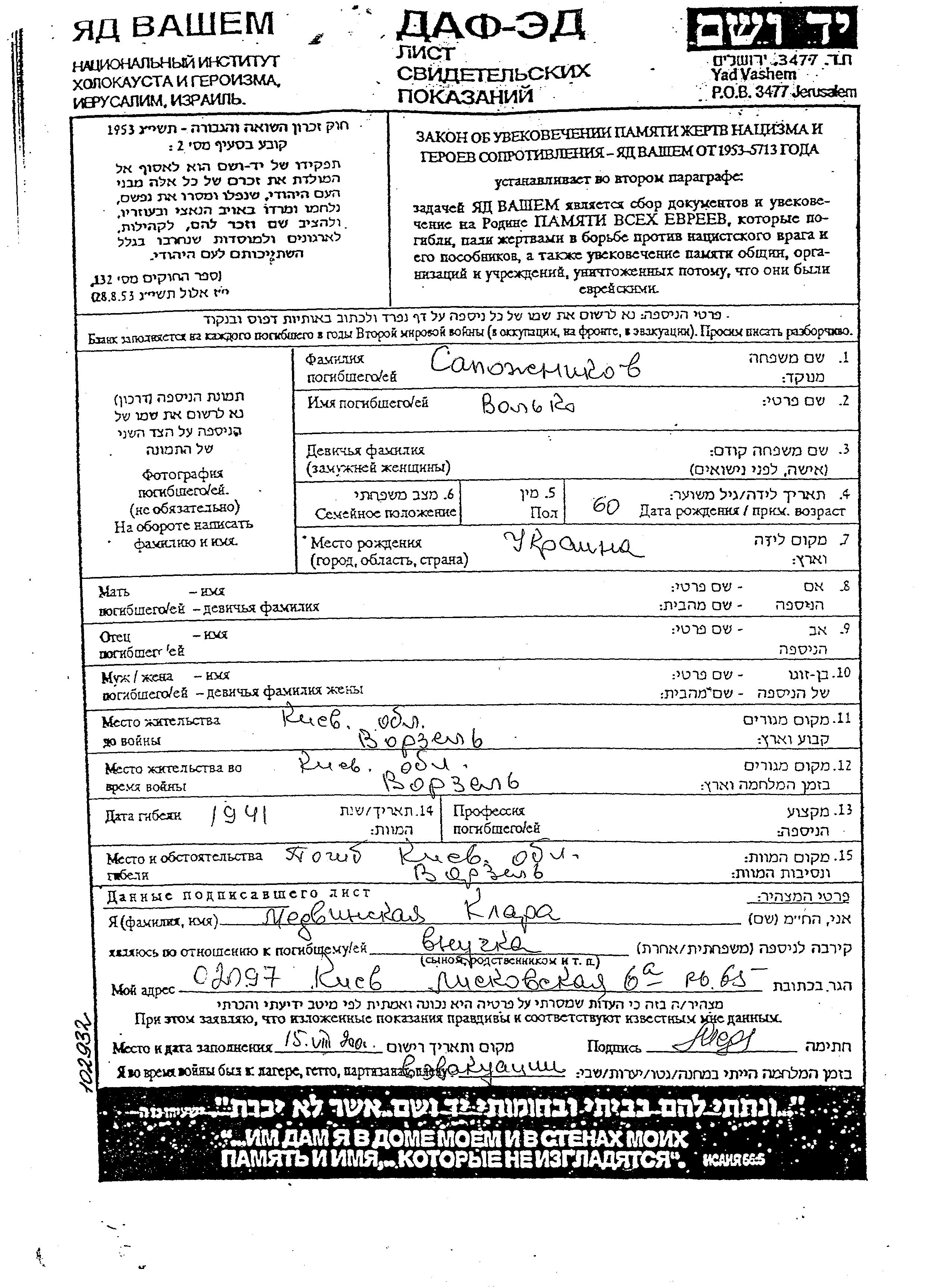 Volko Sapoznikov was born in Ukraine (USSR). Prior to WWII he lived in Vorzel, Ukraine (USSR). During the war he was in Vorzel, Ukraine (USSR). Volko was murdered in the Shoah. Place of death: Vorzel, Ukraine (USSR), 1941.
