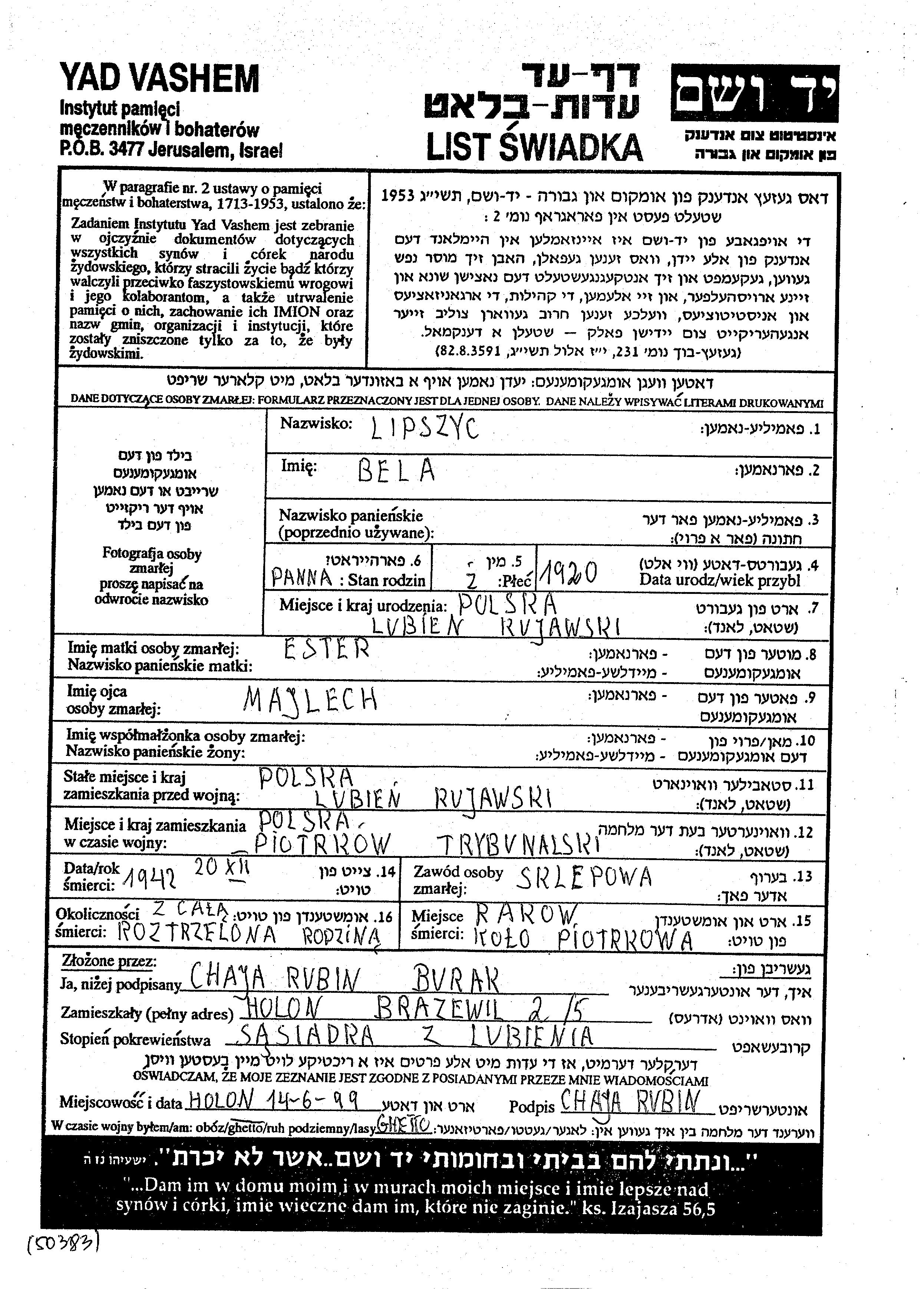 Lipszyc Bela 1920 Lubien Kujawski, Poland Page of Testimony