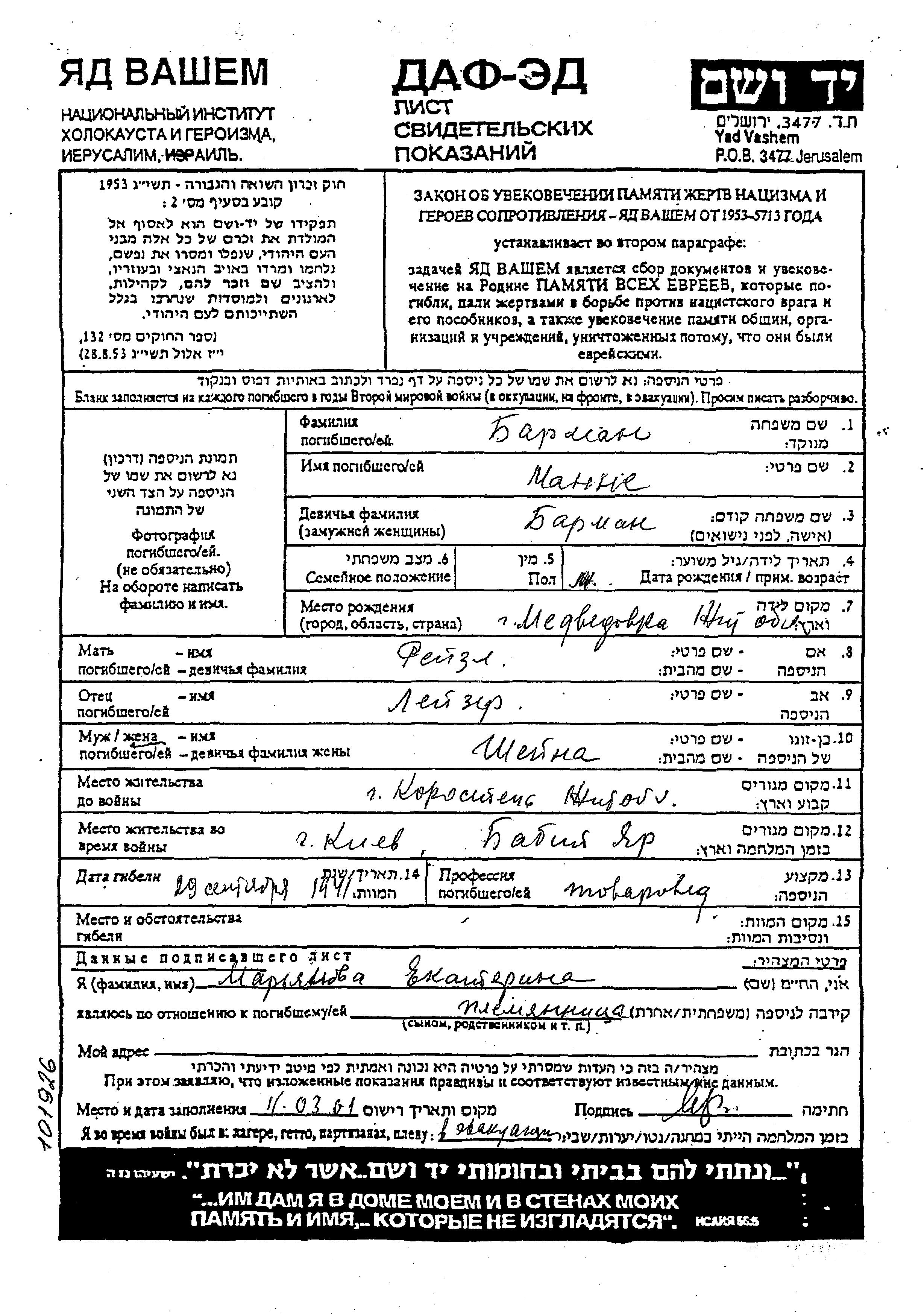 Yad Vashem - Pages of Testimony Names Memorial Collection