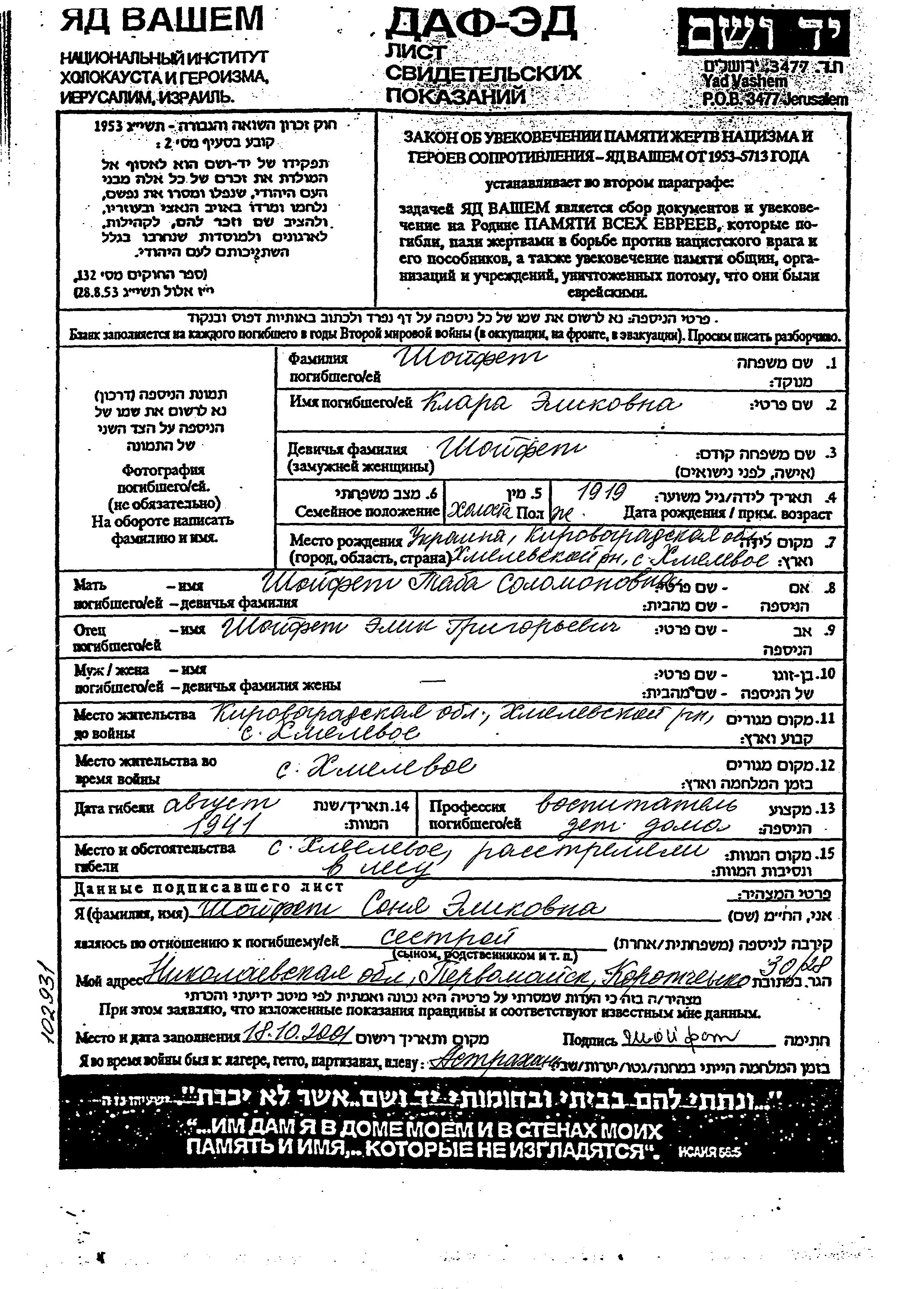 Klara Shoifet was born in Khmelevoye, Ukraine (USSR), 1919 to Alik Elik and Taba Taba. She was a nursery school teacher and single. Prior to WWII she lived in Khmelevoye, Ukraine (USSR). During the war she was in Khmelevoye, Ukraine (USSR). Klara was murdered in the Shoah. Place of death: Khmelevoye, Ukraine (USSR), 1941.