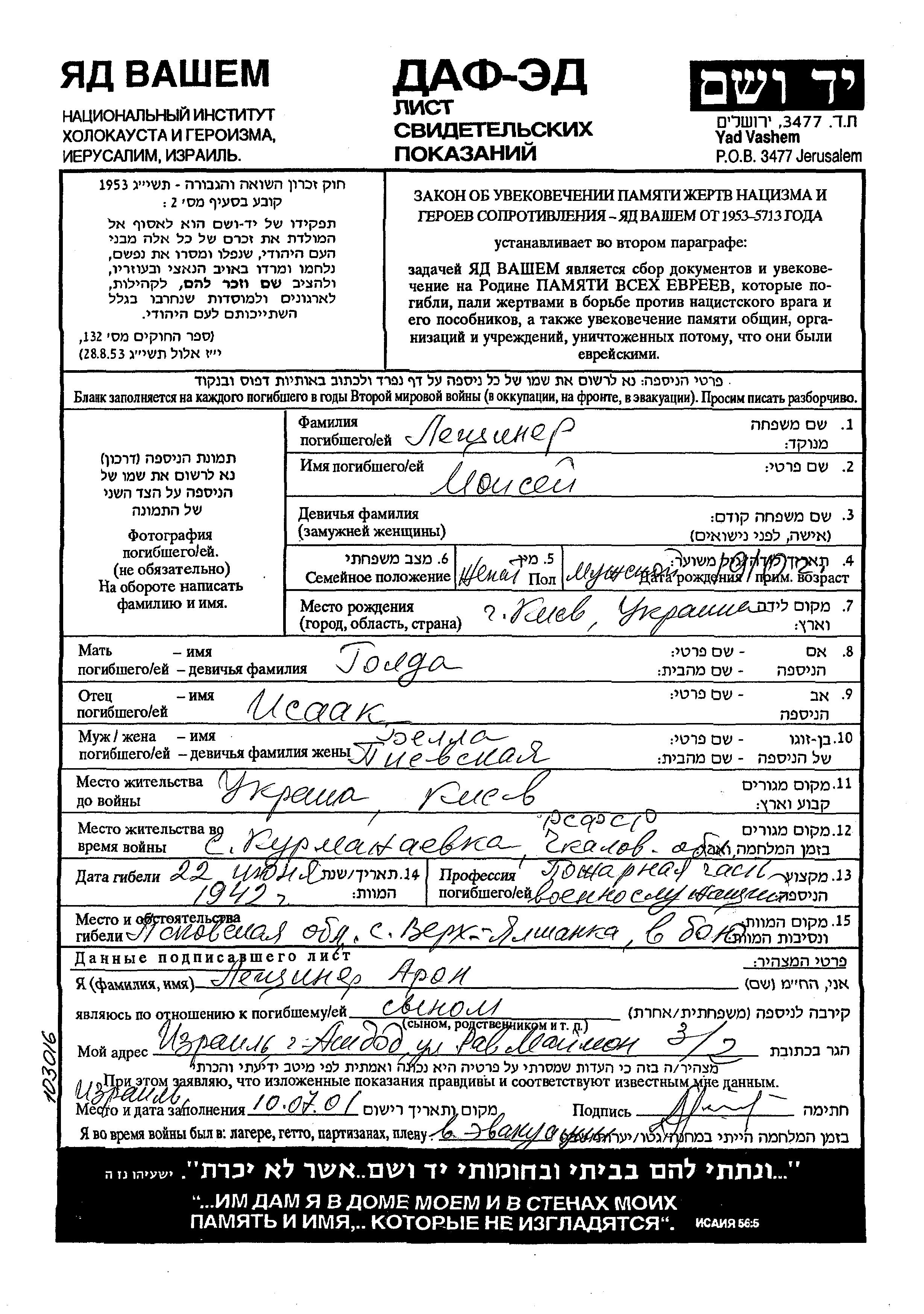 Moisei Leshchiner was born in Kiev, Ukraine (USSR), 1910 to Isaak and Golda. He was a fireman and married to Bella nee Piyevskaya. Prior to WWII he lived in Kiev, Ukraine (USSR). During the war he was in the Soviet armed forces. Moisei was killed in military service in WWII. Place of death: Pskov, Russia (USSR), 1942.
