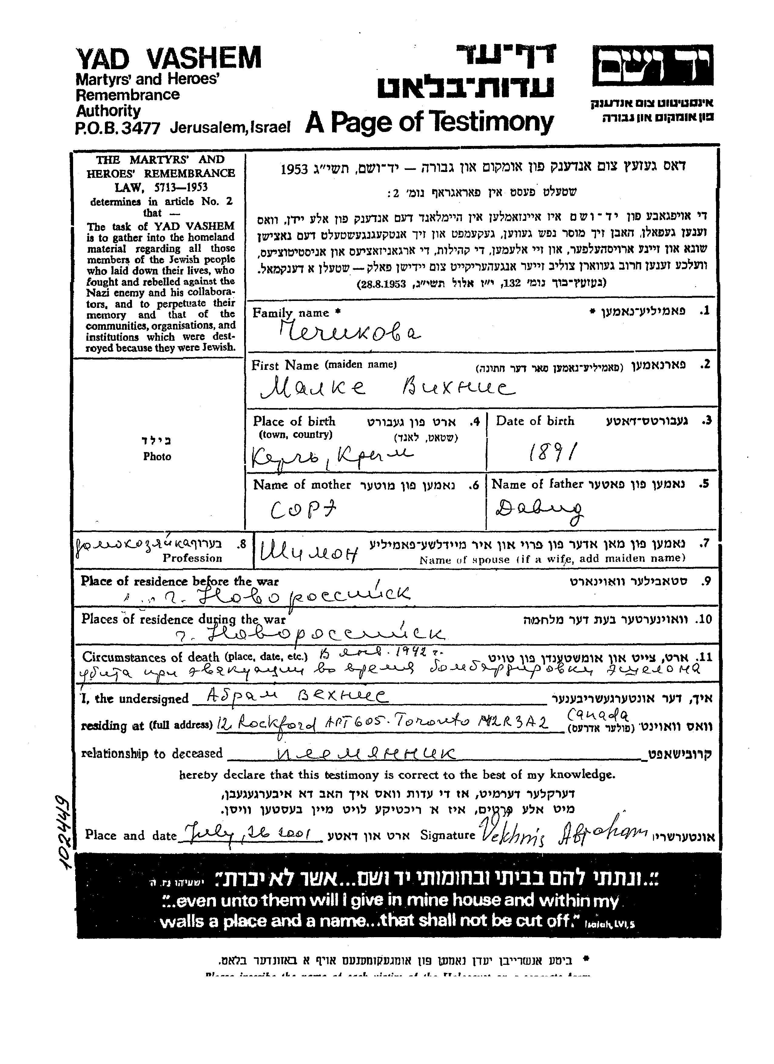 Malke Chechikova nee Vikhnis was born in Kerch, Russia (USSR), 1891 to David and Sore. Prior to WWII she lived in Novorossiysk, Russia (USSR). During the war she was in Novorossiysk, Russia (USSR). Malke was murdered in the Shoah. Place of death: unknown, 1942.