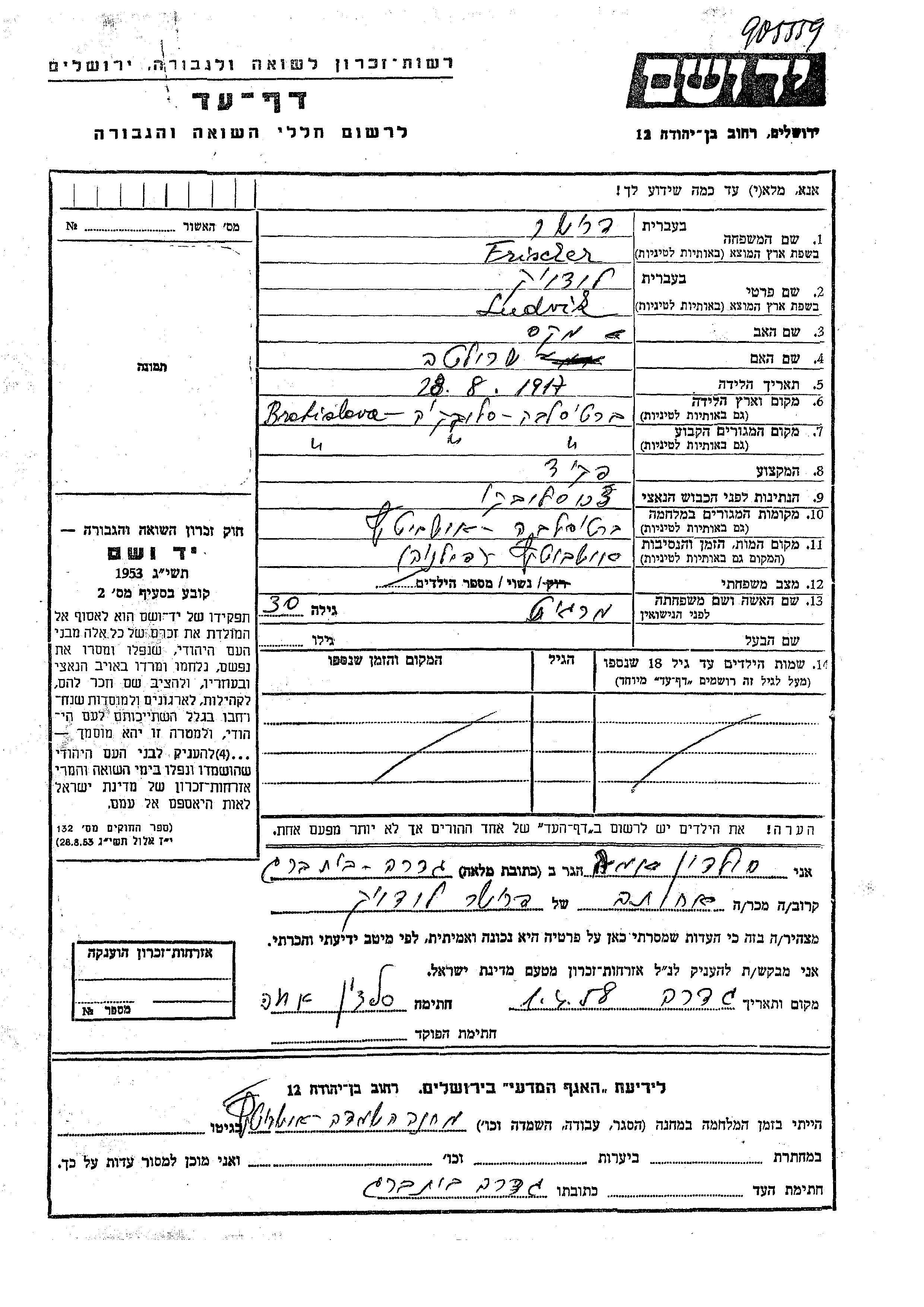 Ludwik Frischer was born in Bratislava, Czechoslovakia, 1917 to Max and Sharolta. He was a clerk and married to Margit. Prior to WWII he lived in Bratislava, Czechoslovakia. During the war he was in Auschwitz, Poland.