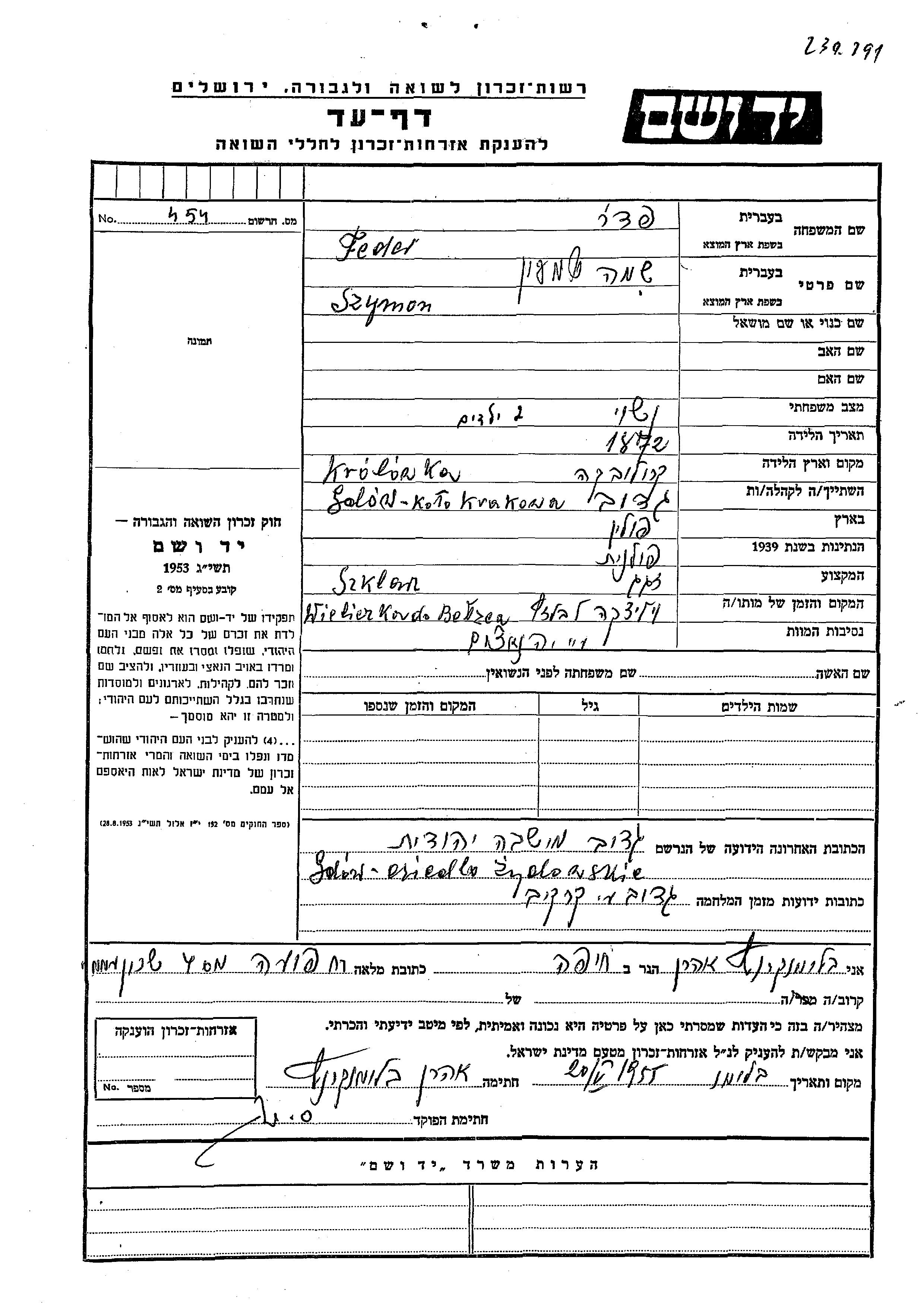 Szymon Shama Feder was born in Krolowka, Poland, 1872. He was a glazier. Prior to WWII he lived in Gdow, Poland. During the war he was in Gdow, Poland. Szymon Shama was murdered in the Shoah. Place of death: Wieliczka, Poland.