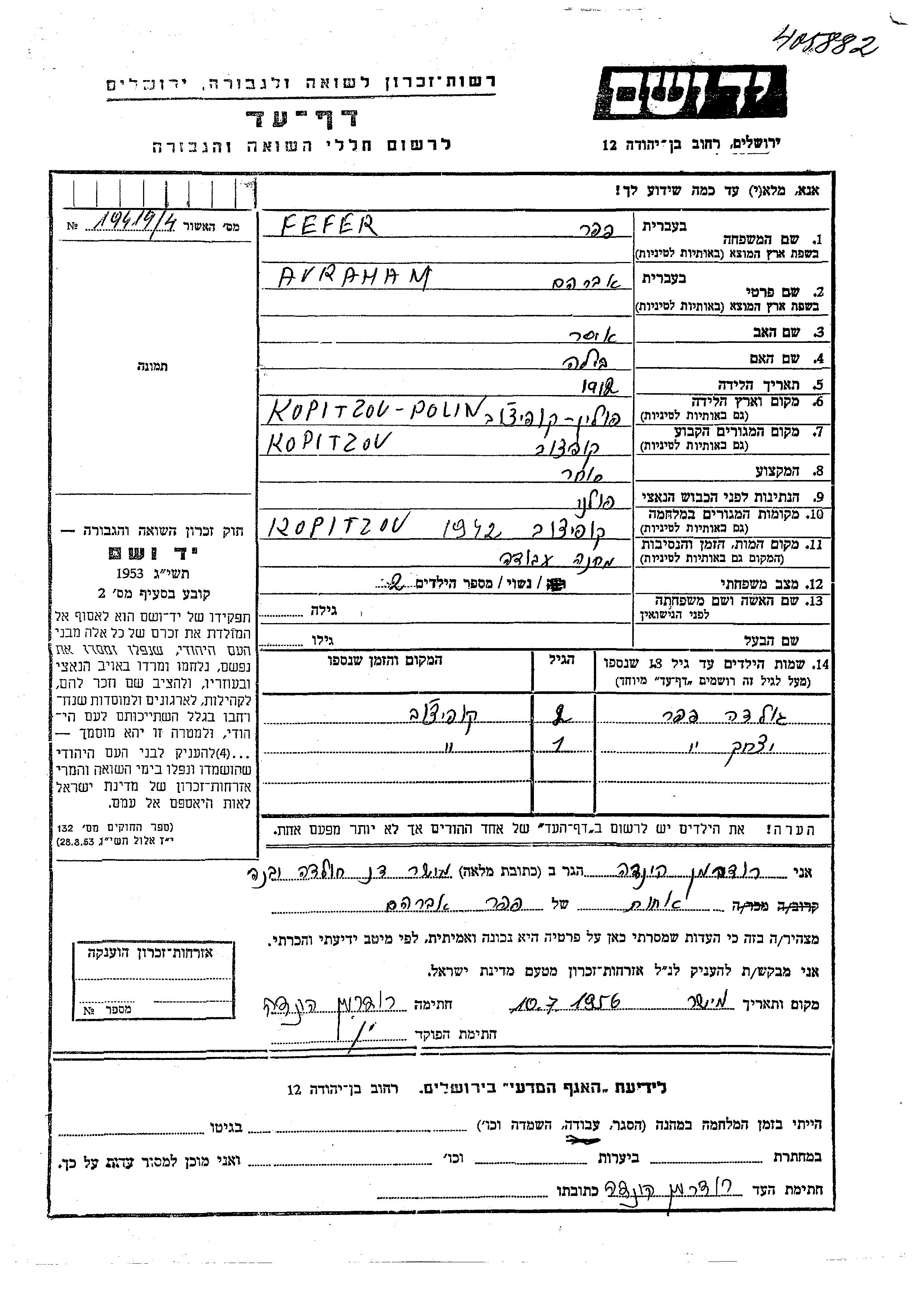 Avraham Fefer was born in Kupiczow, Poland, 1912 to Isser and Bila. He was a merchant and married. Prior to WWII he lived in Kupiczow, Poland. During the war he was in Kupiczow, Poland. Avraham was murdered in the Shoah. Place of death: unknown, 1942.