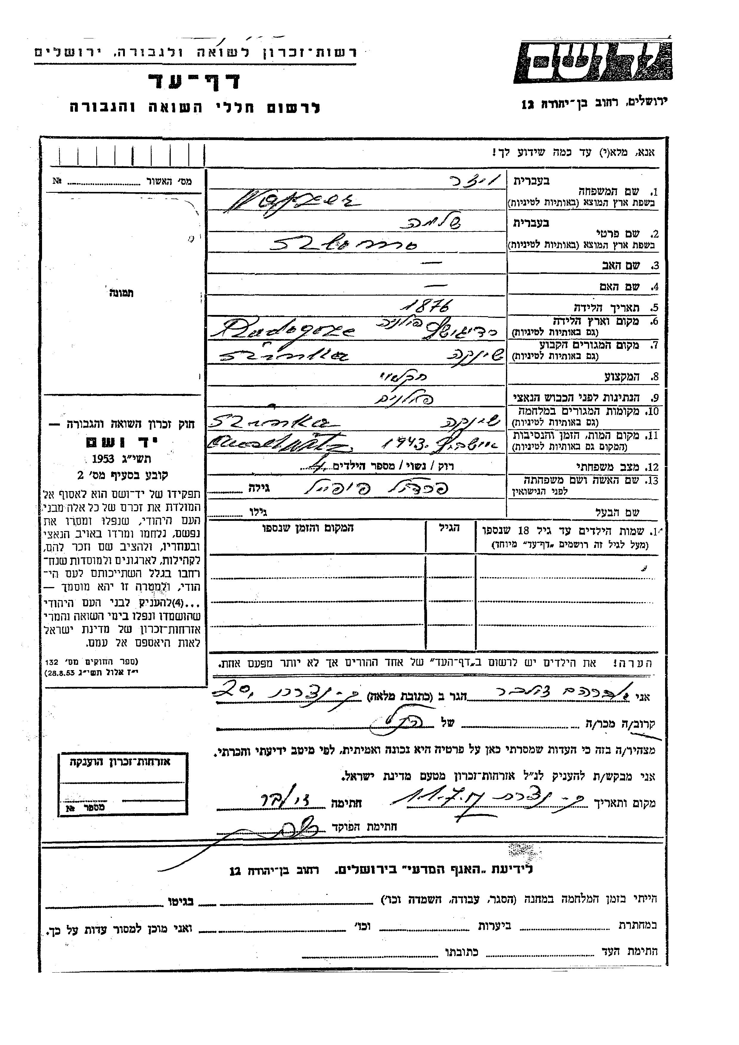 Szlomo Wajzer was born in Radgoszcz, Poland, 1876. He was an agriculturist and married to Fradil nee Popel. Prior to WWII he lived in Skrzynka, Poland. During the war he was in Skrzynka, Poland. Szlomo was murdered in the Shoah. Place of death: Auschwitz, Poland, 1943.