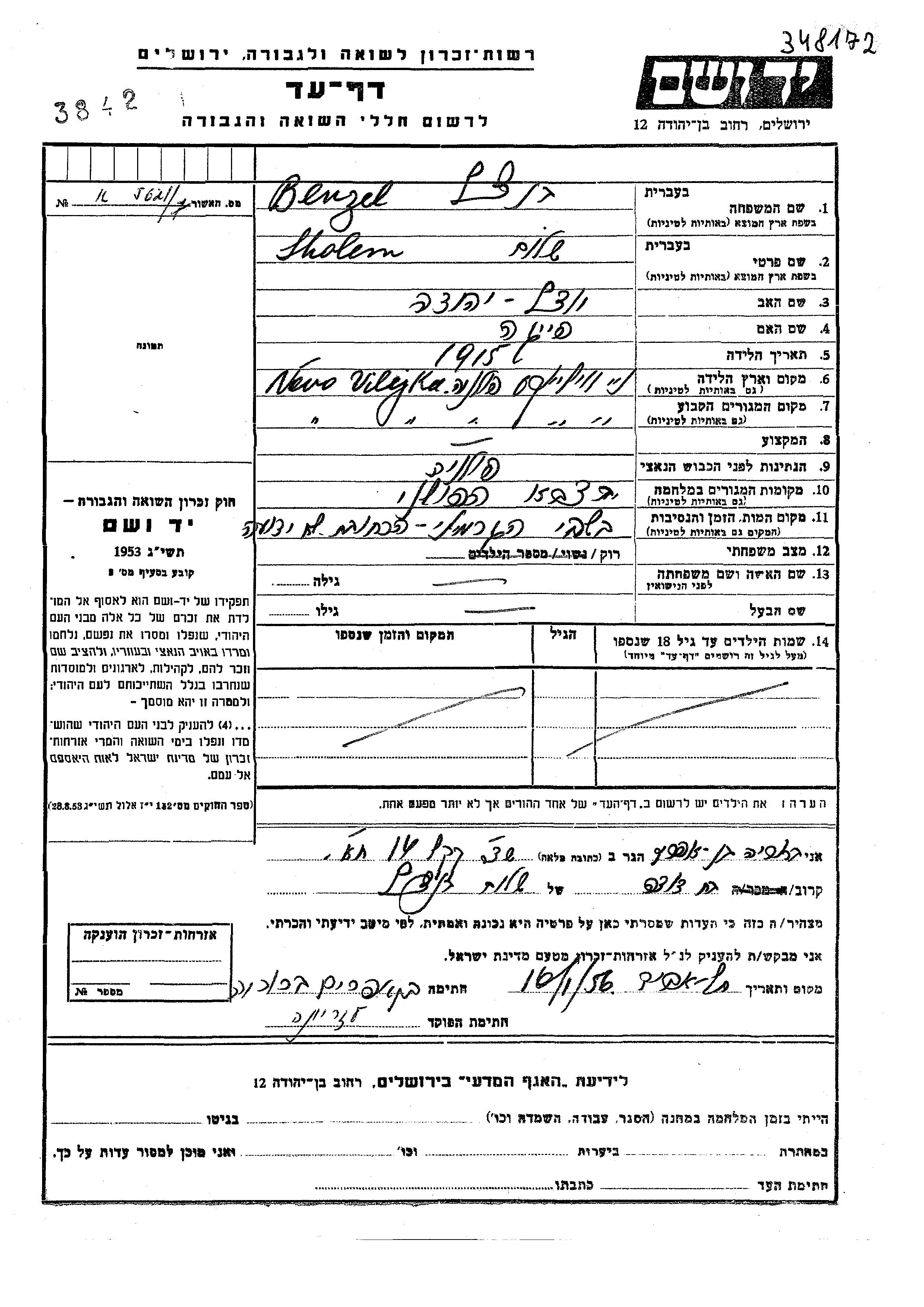 Shulem Benzel Bentzel was born in Nowa Wilejka, Poland, 1915 to Iudl and Feiga. He was single. Prior to WWII he lived in Nowa Wilejka, Poland. During the war he was in the Polish armed forces. Shulem was murdered in the Shoah.