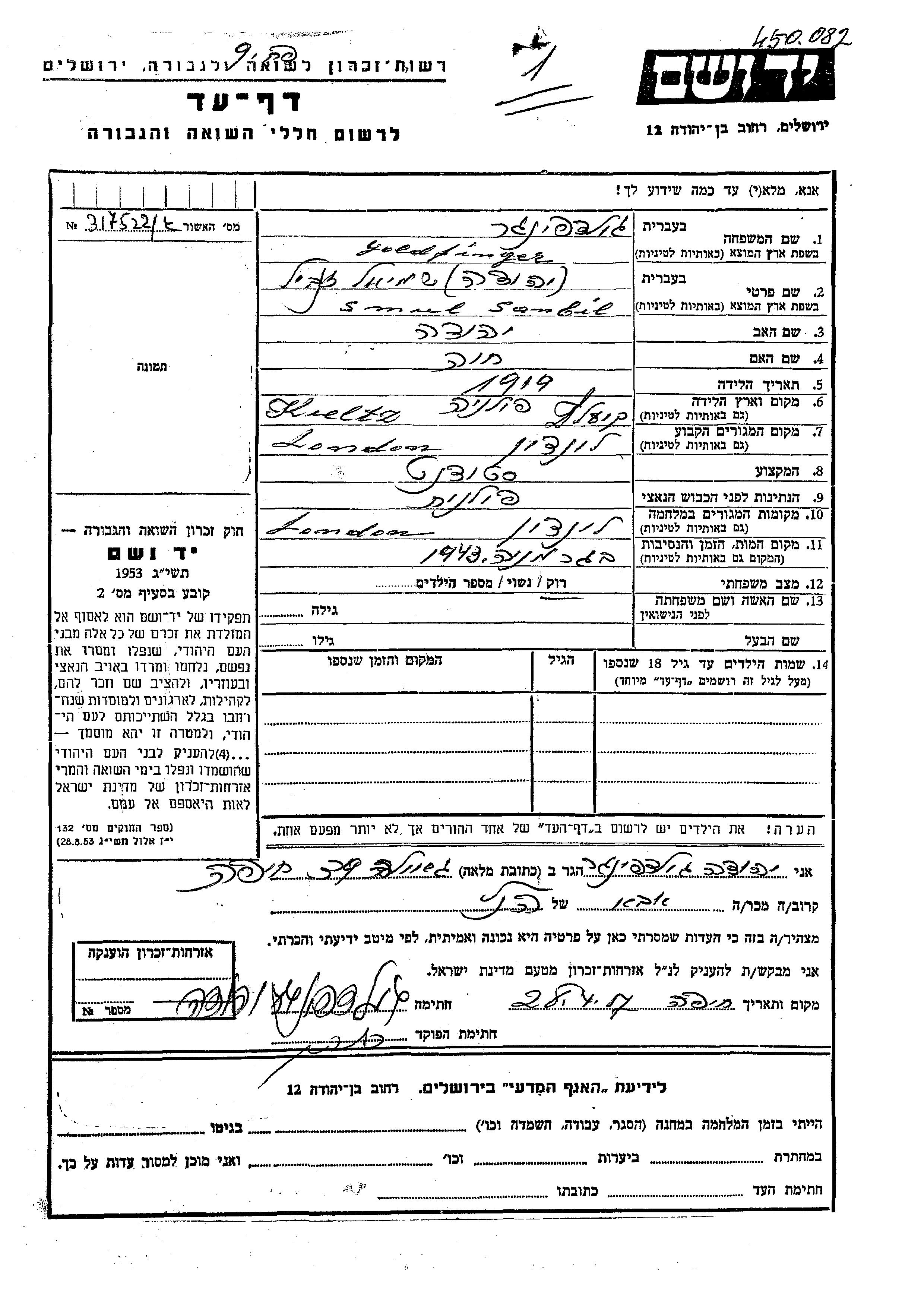 Smul Yehuda Goldfinger was born in Kielce, Poland, 1919 to Yehuda and Khava. He was a student and single. Prior to WWII he lived in London, United Kingdom. During the war he was in London, United Kingdom.