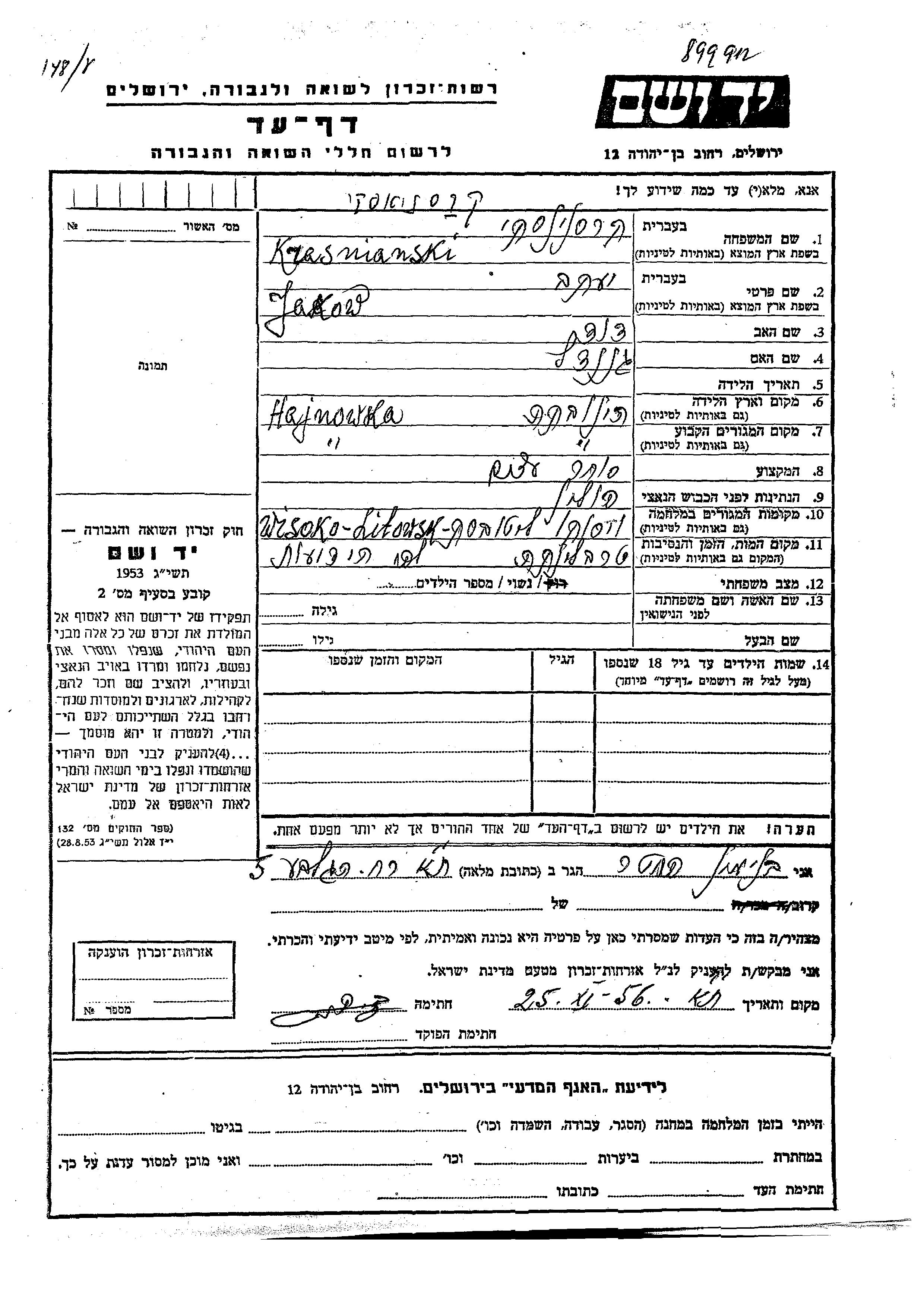 Jakow Krasnianski was born in Hajnówka, Poland to David and Genendl. He was a wood merchant and married. Prior to WWII he lived in Hajnówka, Poland. During the war he was in Wisoko Mazow, Poland. Jakow was murdered in the Shoah. Place of death: Treblinka, Poland.