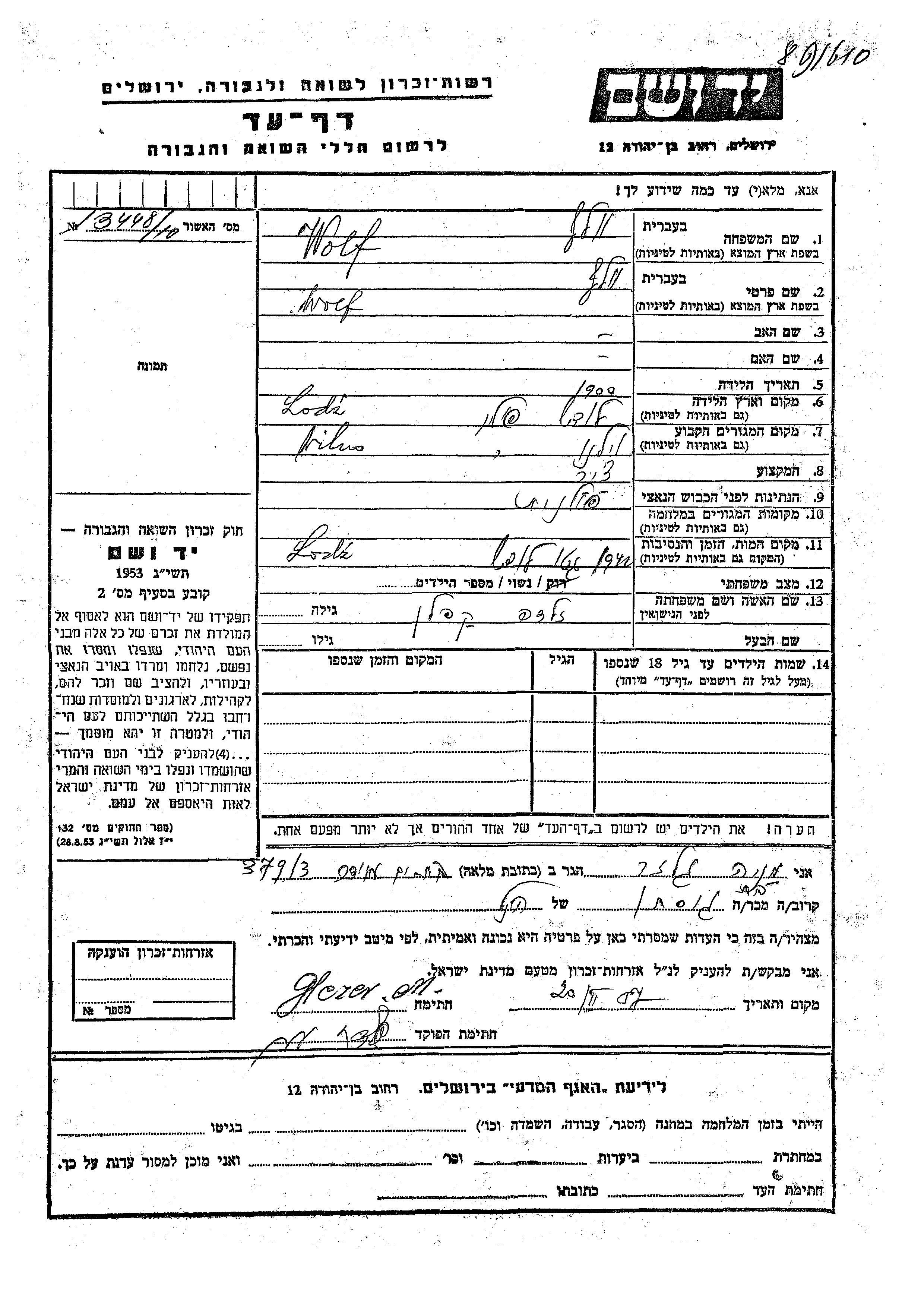 Wolf Wolf was born in Lodz, Poland, 1900. He was a painter (artist) and married to Zelda nee Kaplan. Prior to WWII he lived in Wilno, Poland.