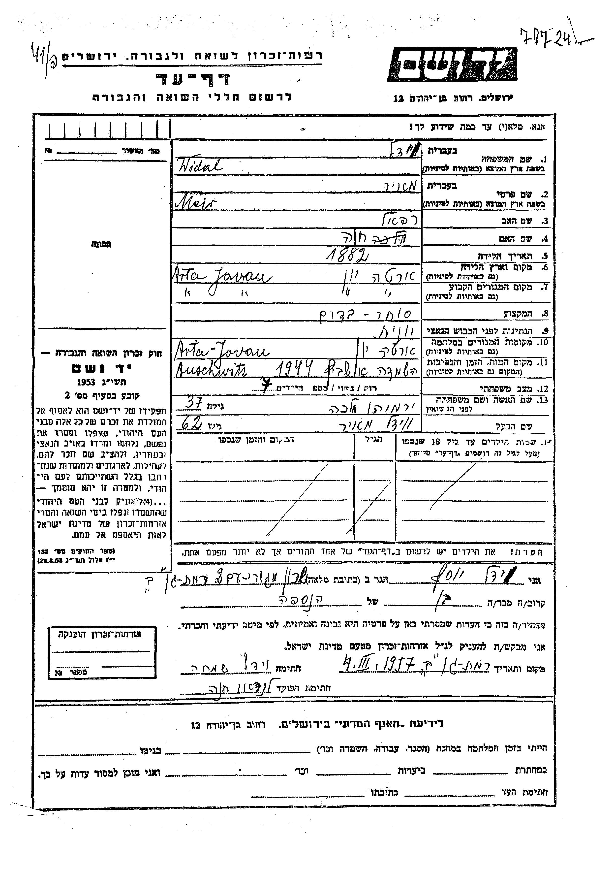 Meir was murdered in the Shoah. Place of death: Auschwitz, Poland, 1944.