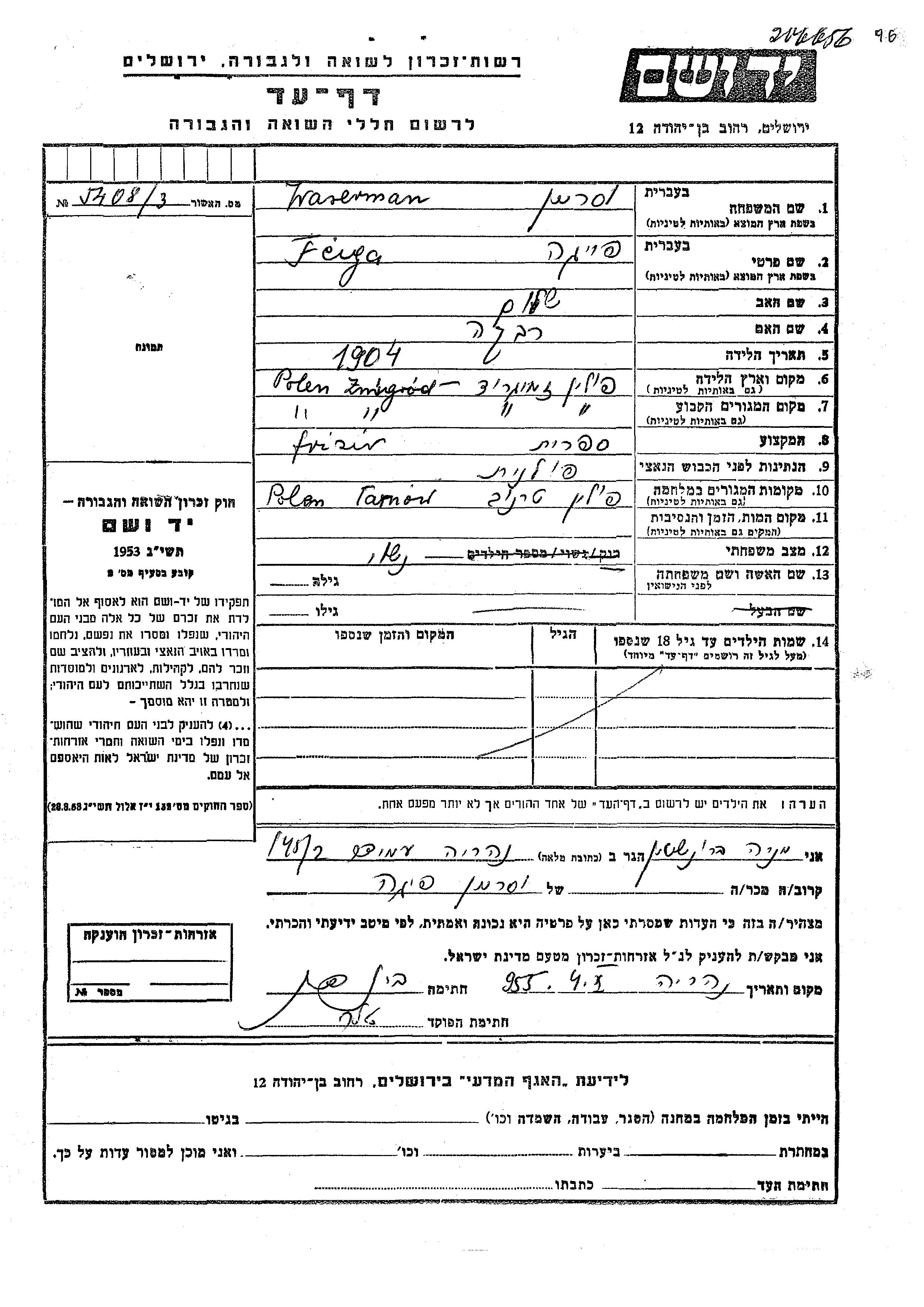 Waserman Feiga 1904 Zmigrod, Poland Page of Testimony