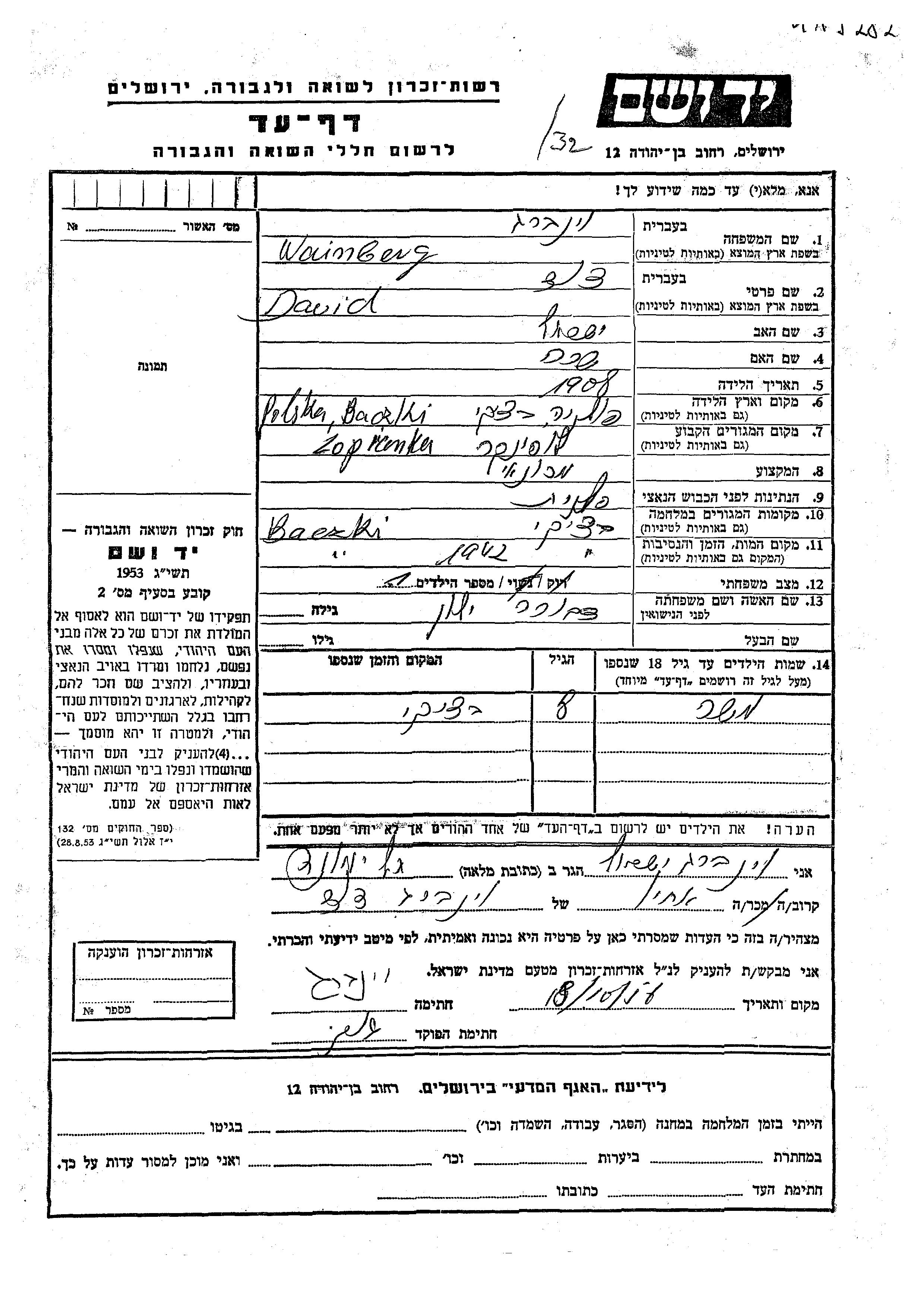 David Wainberg was born in Baczki, Poland, 1908 to Yisrael and Sara. He was a mechanic and married to Dvora nee Ialon. Prior to WWII he lived in Lopianka, Poland. During the war he was in Baczki, Poland. David was murdered in the Shoah. Place of death: Baczki, Poland, 1942.
