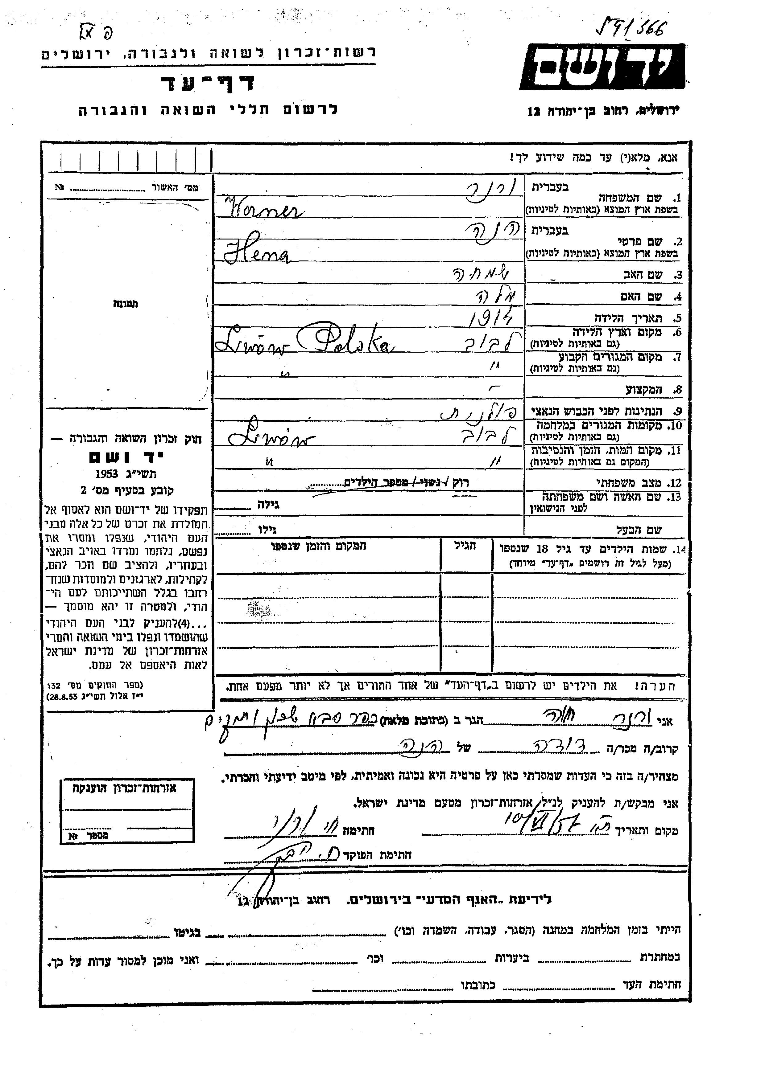 Werner Hena 1914 Lwow, Poland Page of Testimony