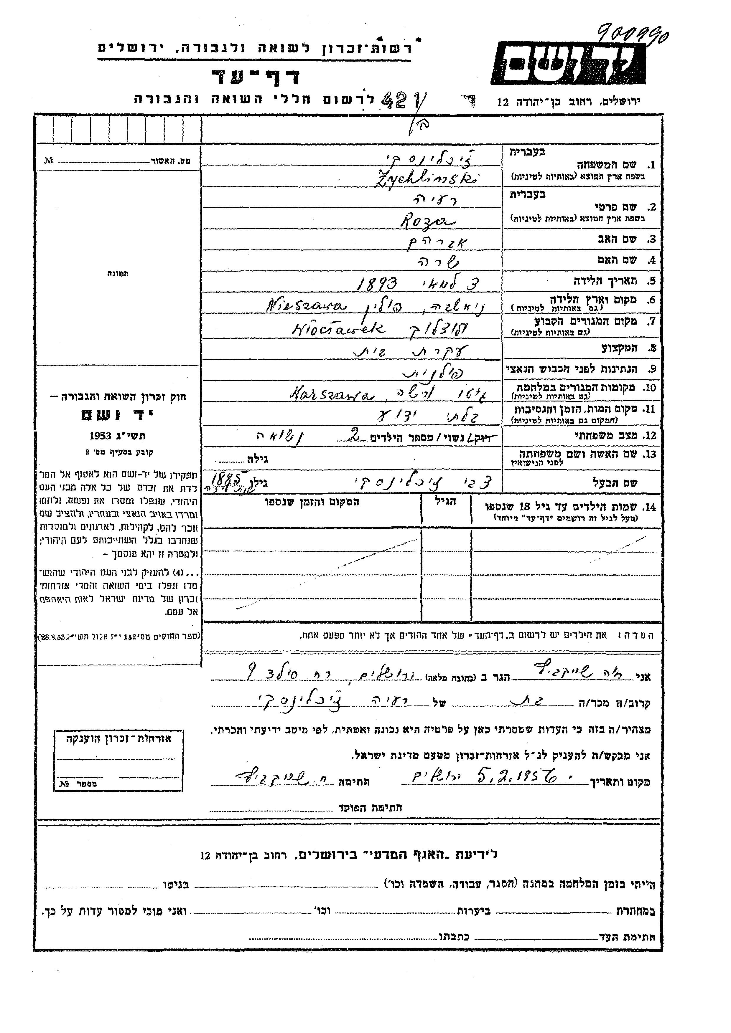 Raya Roza Zychlinski was born in Nieszawa, Poland, 1893 to Avraham and Sara. She was a housewife and married to Tzvi. Prior to WWII she lived in Wloclawek, Poland. During the war she was in Warszawa, Poland. Raya Roza was murdered in the Shoah.