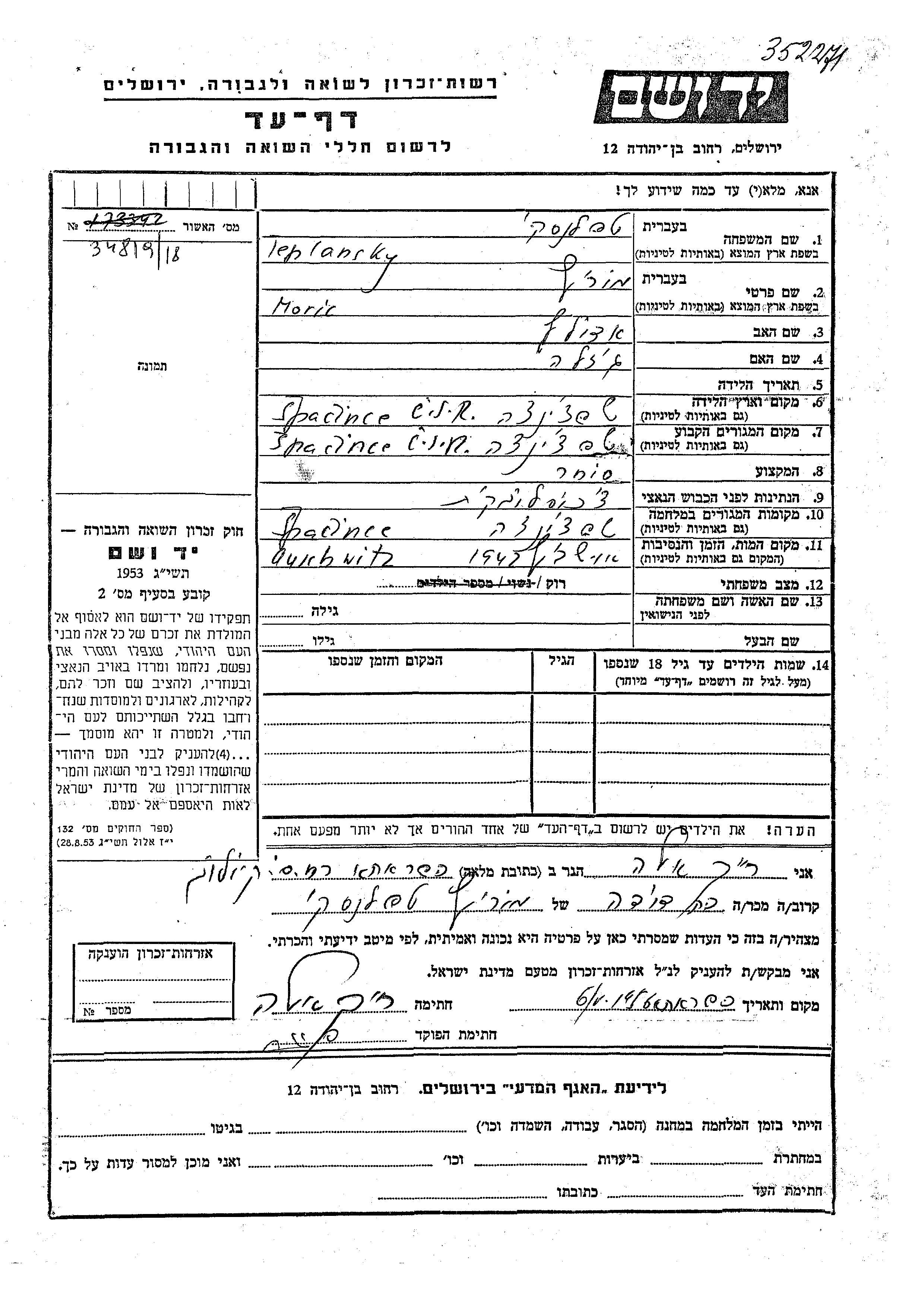 Teplansky Moric Spacince, Czechoslovakia Page of Testimony