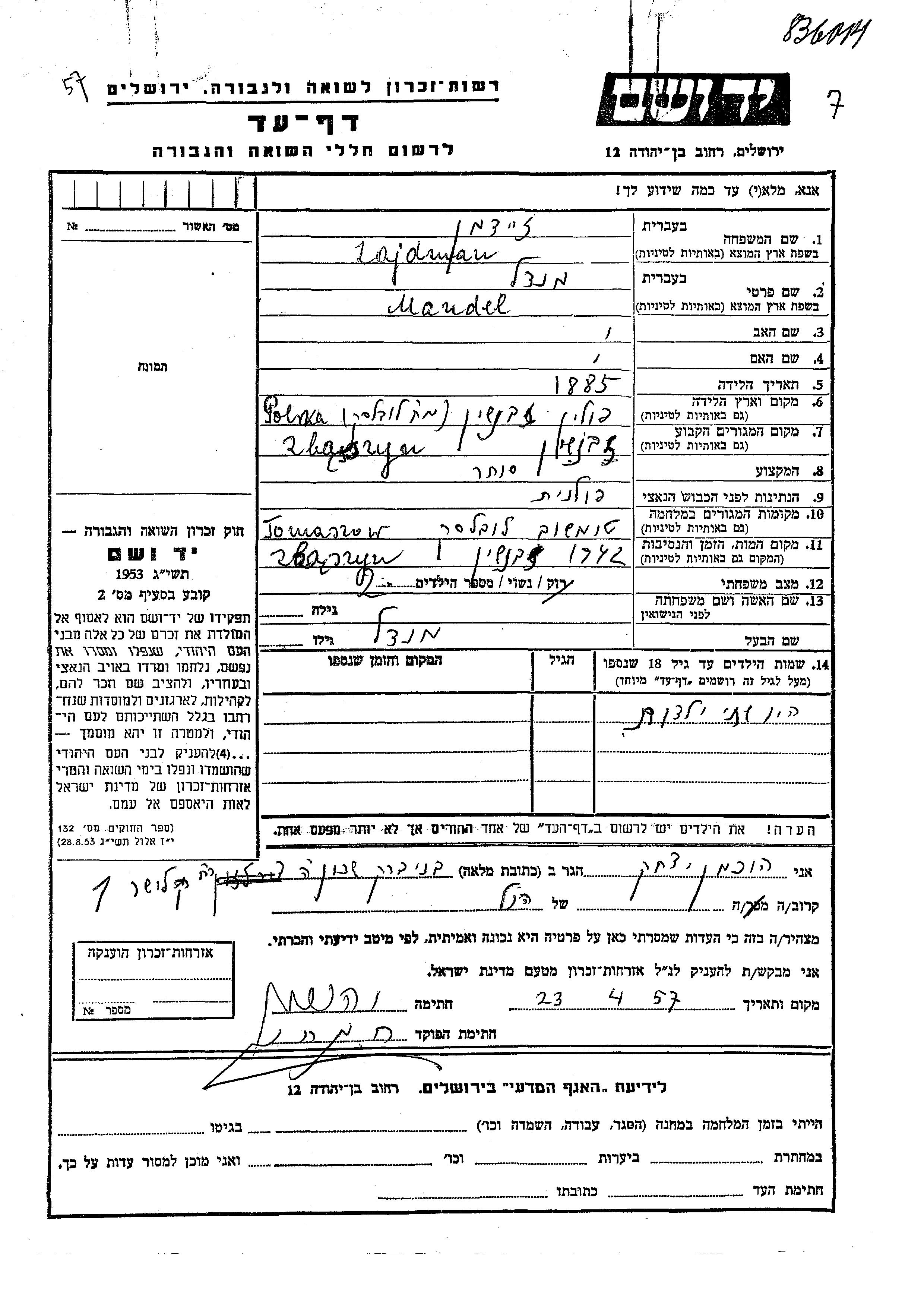 Mendel Zajdman was born in Zbaszyn, Poland, 1885. He was a merchant and married. Prior to WWII he lived in Zbaszyn, Poland. During the war he was in Tomaszow, Poland. Mendel was murdered in the Shoah. Place of death: Zbaszyn, Poland, 1942.