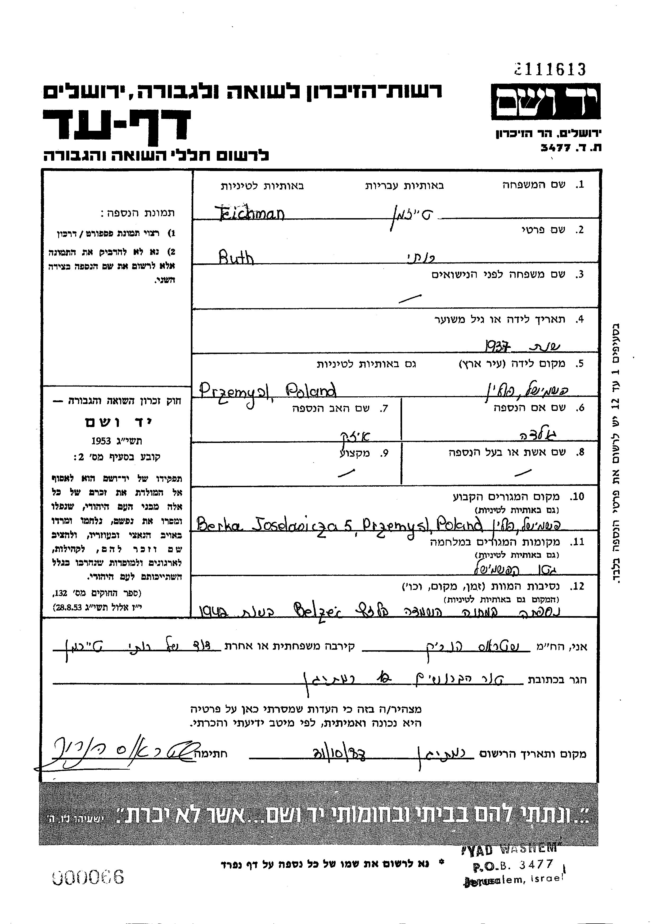 Teichman Ruth 1937 Przemysl, Poland Page of Testimony