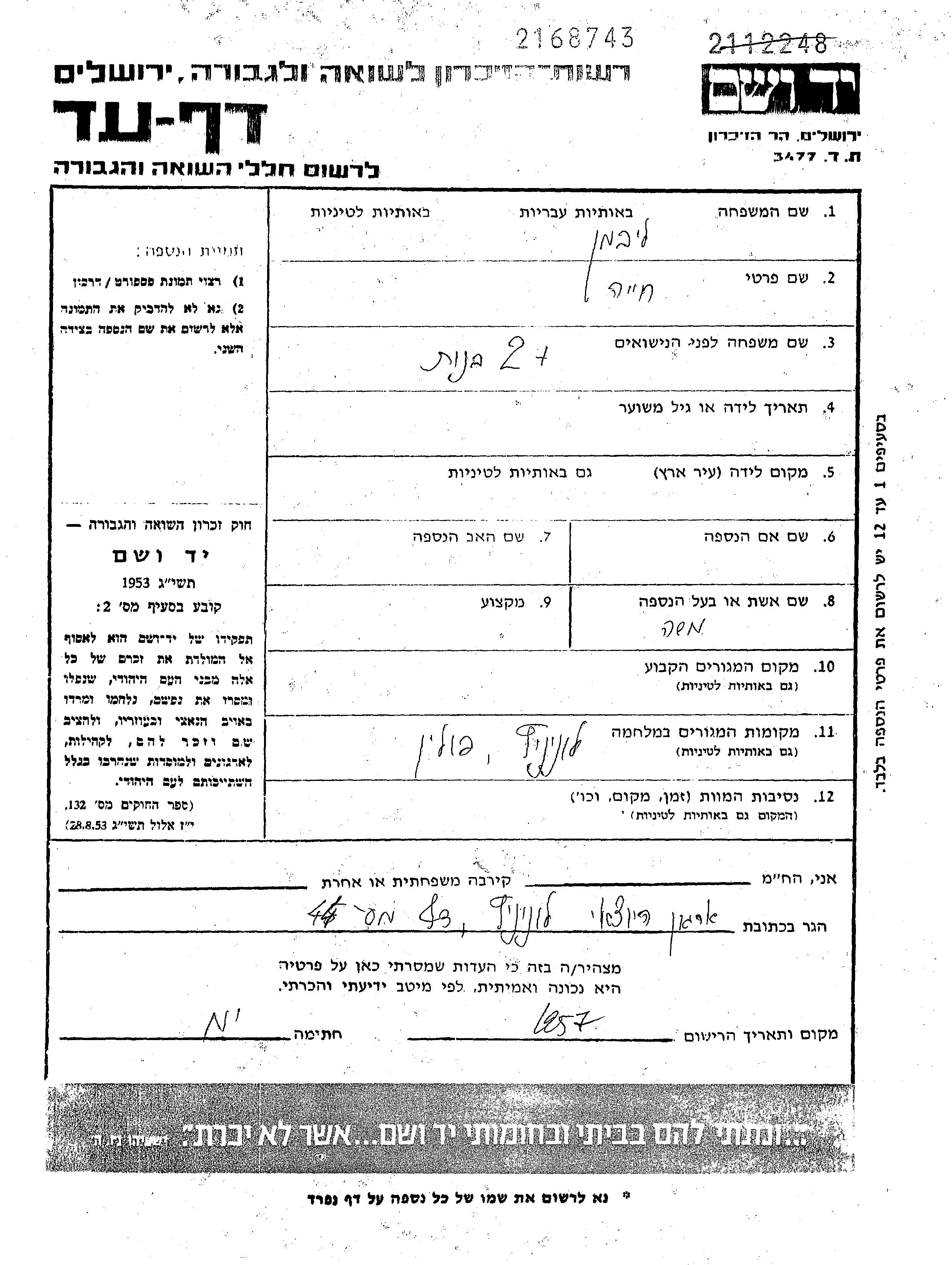 Libman Khaia Luniniec, Poland Page of Testimony