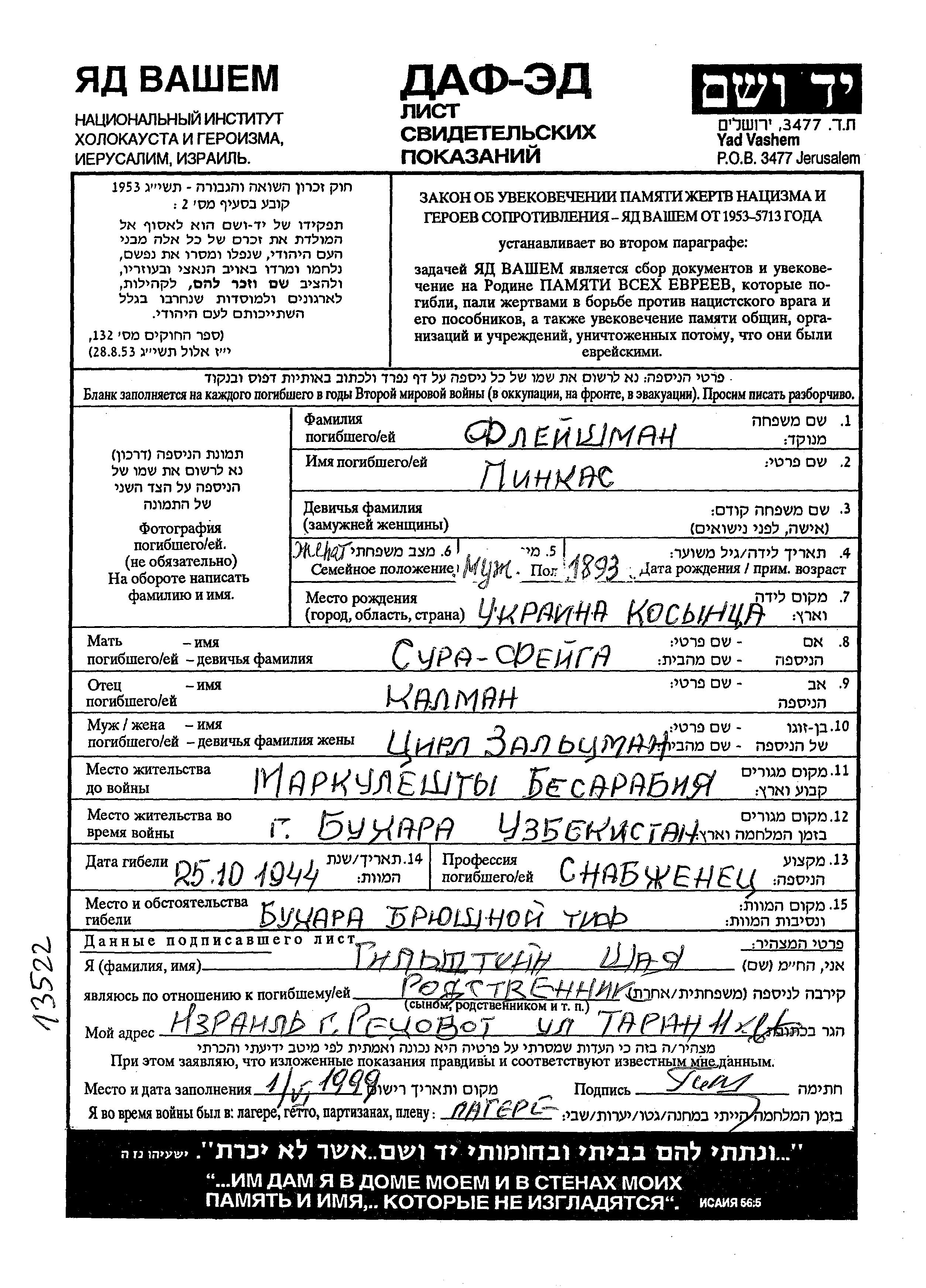 Pinkas Fleishman was born in Kosienice, Poland, 1893 to Kalman and Sura Feiga. He was married to Tzirl nee Zaltzman. Prior to WWII he lived in Markulesty, Romania. During the war he was in Bukhara, Uzbekistan (USSR). Pinkas was registered following the evacuation/ in the interior of the Soviet Union.