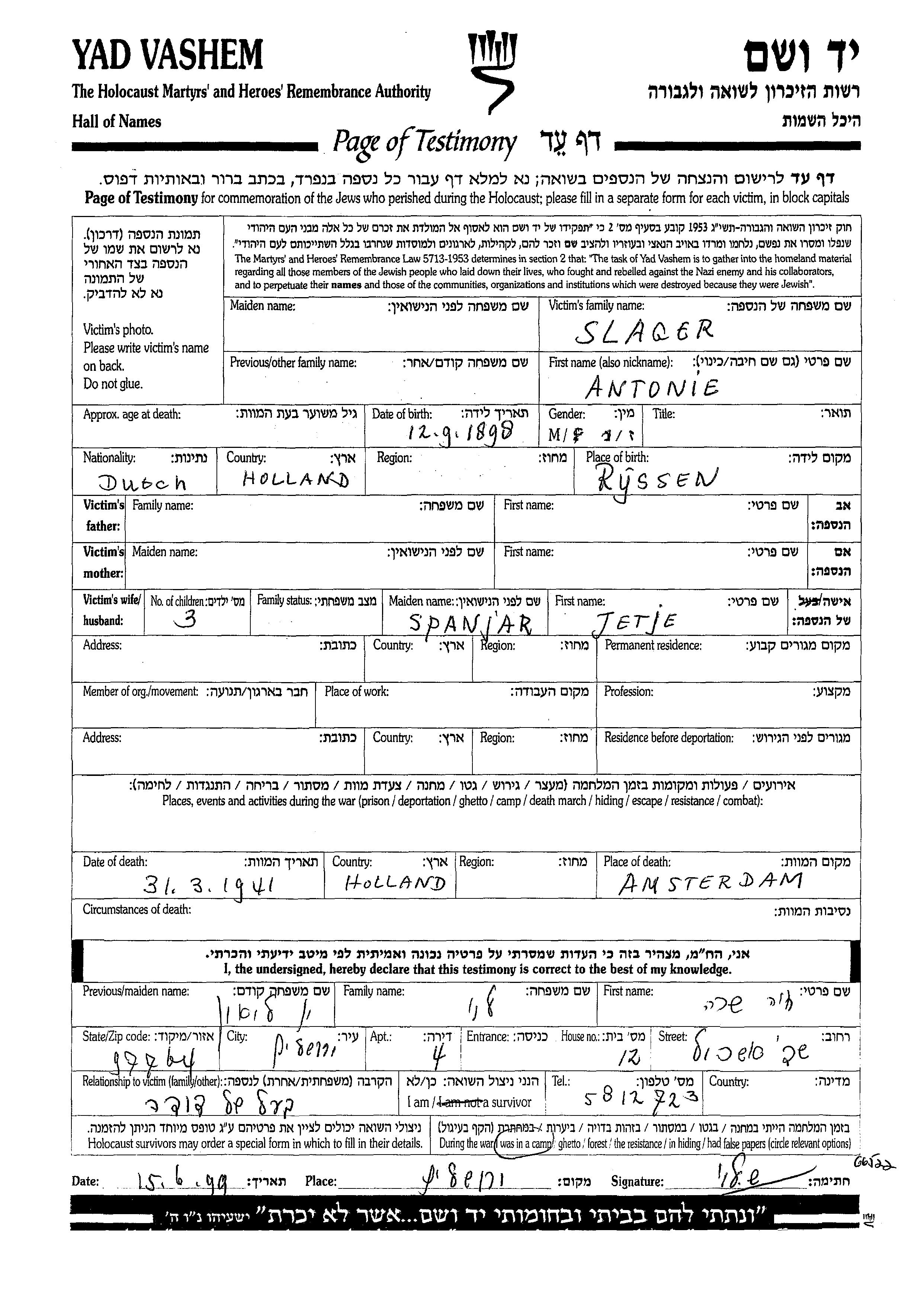 Antonie Slager was born in Rijssen, The Netherlands, 1898. Prior to WWII she lived in Rijssen, The Netherlands. Antonie was murdered in the Shoah. Place of death: Amsterdam, The Netherlands, 31/03/1941.