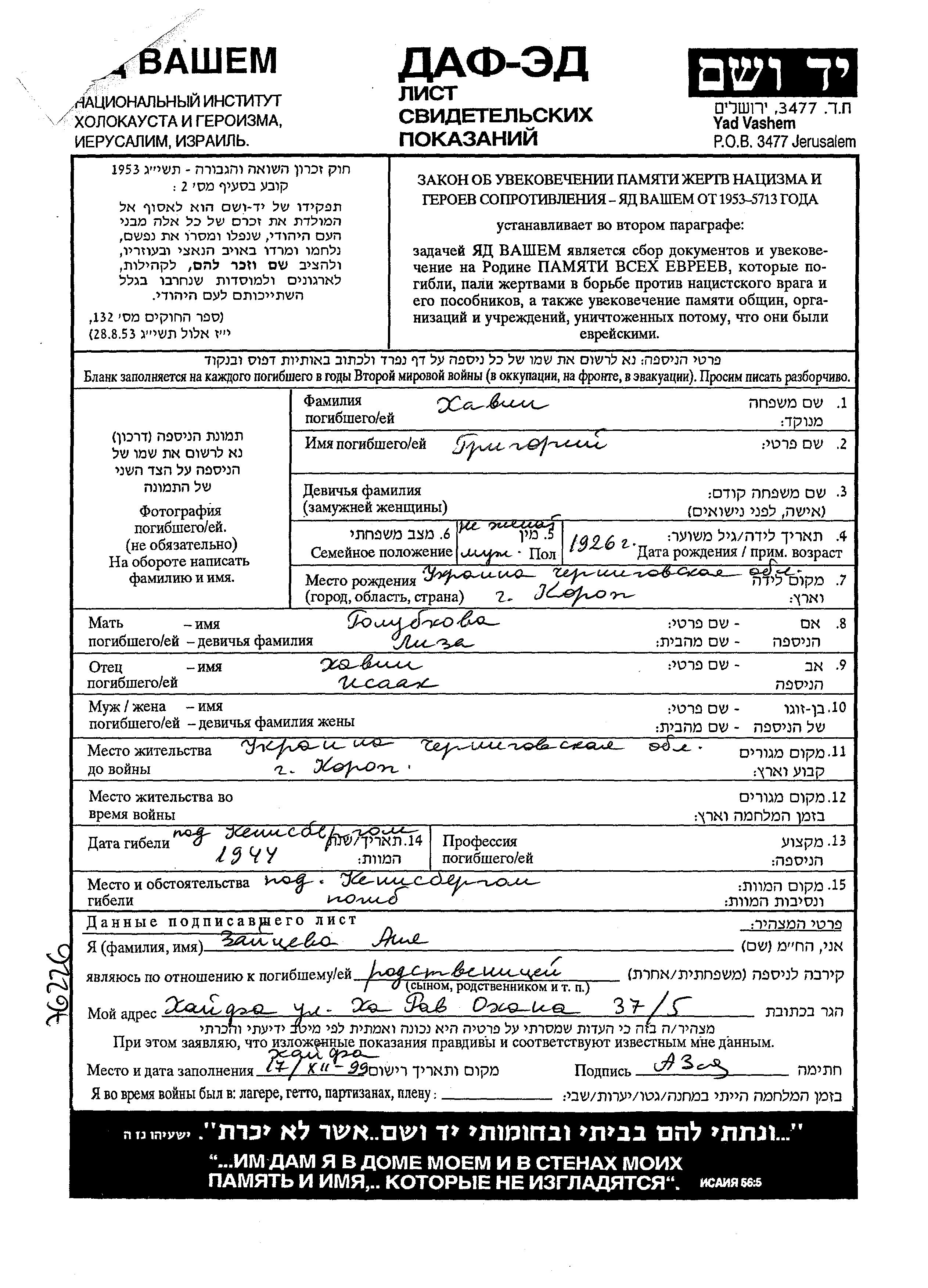 Grigori Khavin was born in Korop, Ukraine (USSR), 1926 to Isaak and Liza. He was single. Prior to WWII he lived in Korop, Ukraine (USSR). During the war he was in the Soviet armed forces. Grigori was killed in military service in WWII. Place of death: Koenigsberg, Germany, 1944.
