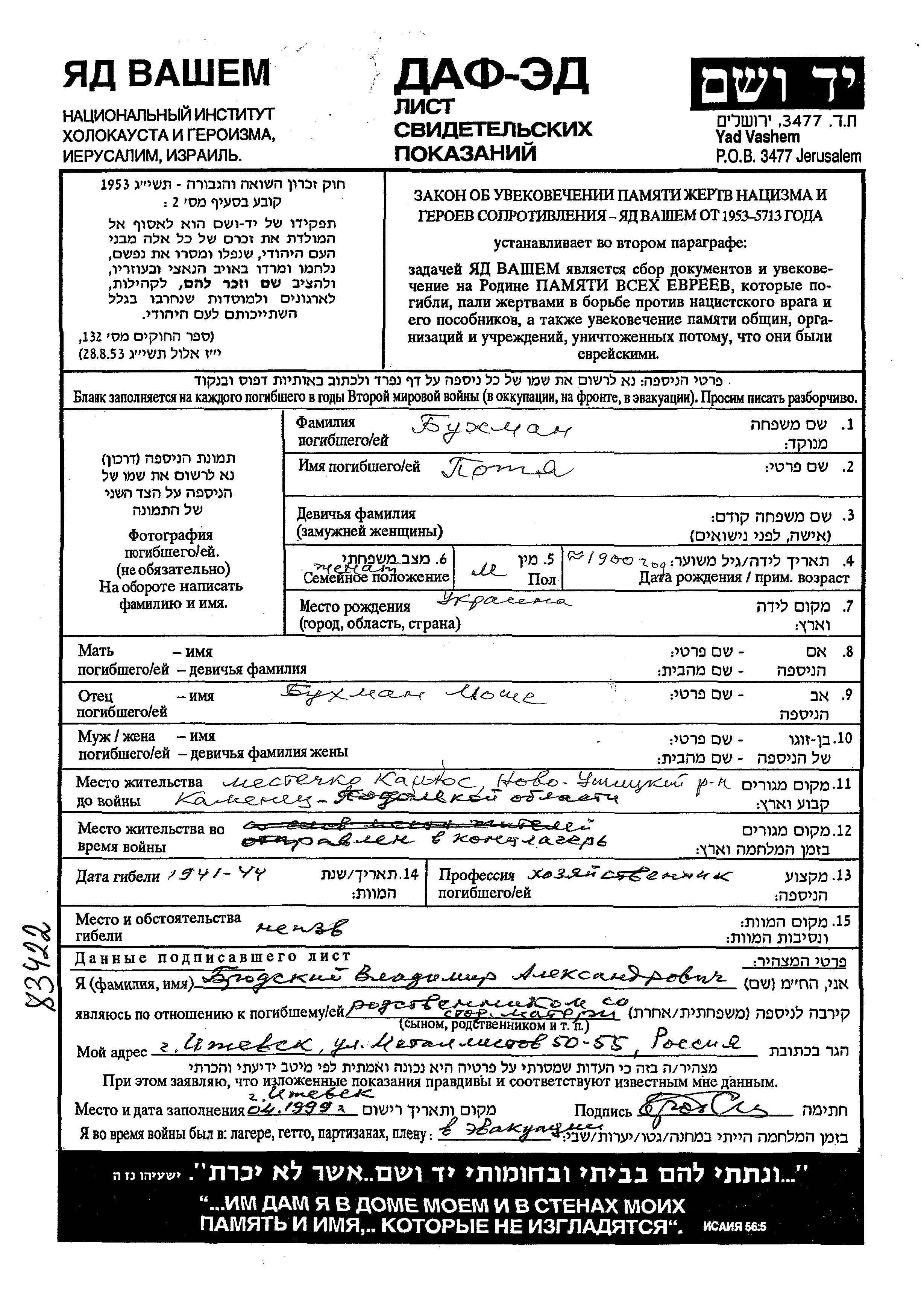 Petya Bukhman was born in Ukraine (USSR), 1900 to Moshe. He was a supply manager and married. Prior to WWII he lived in Kalyus, Ukraine (USSR). Petya was murdered in the Shoah. Place of death: Camp.