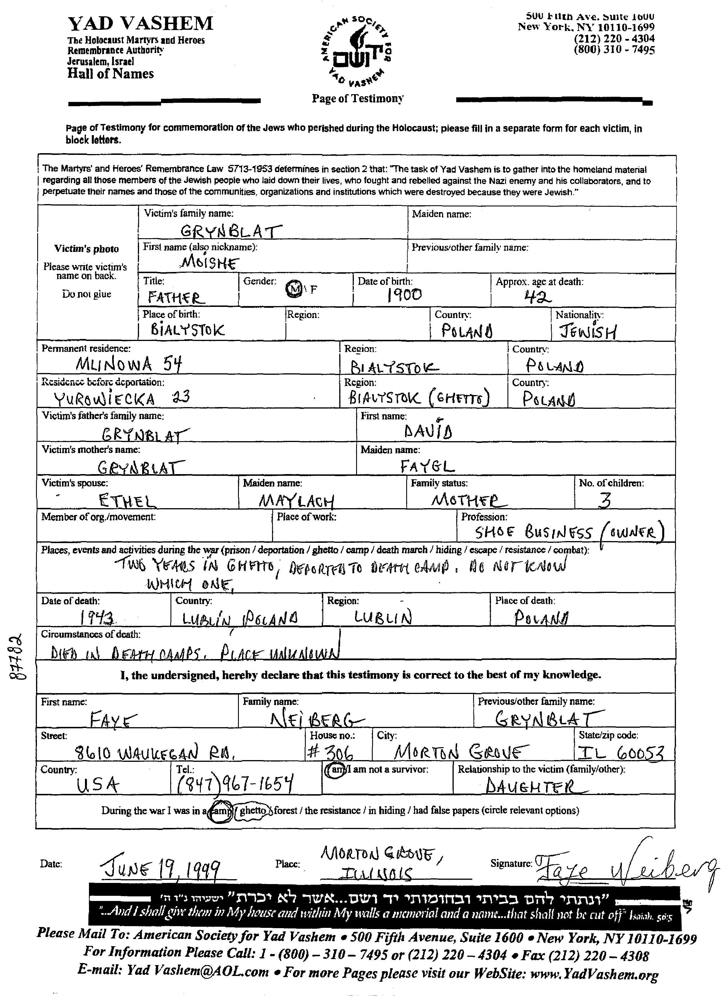 Grynblat Moishe 1900 Bialystok, Poland Page of Testimony