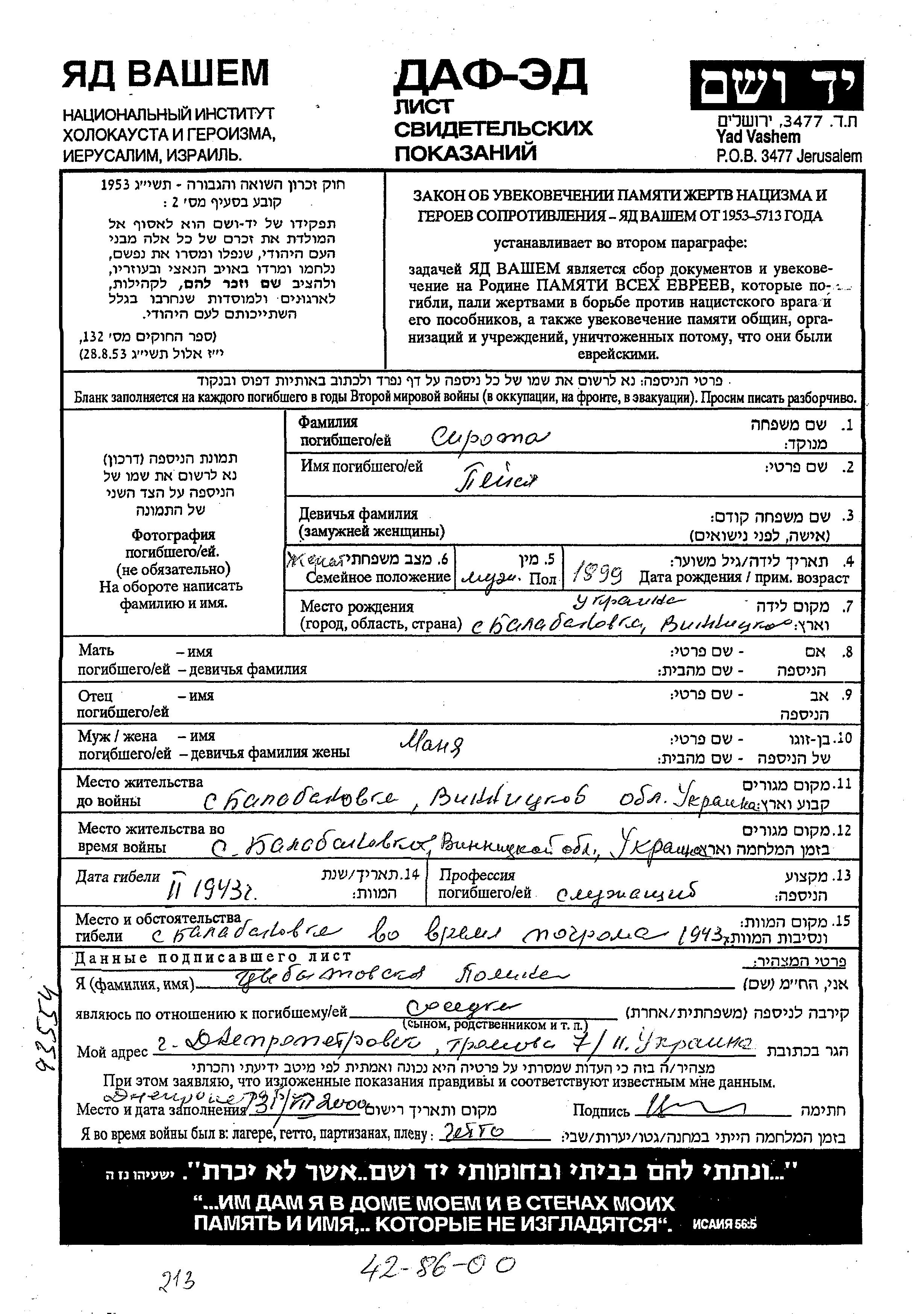Sirota Peisl 1899 Balabanovka, Ukraine (USSR) Page of Testimony