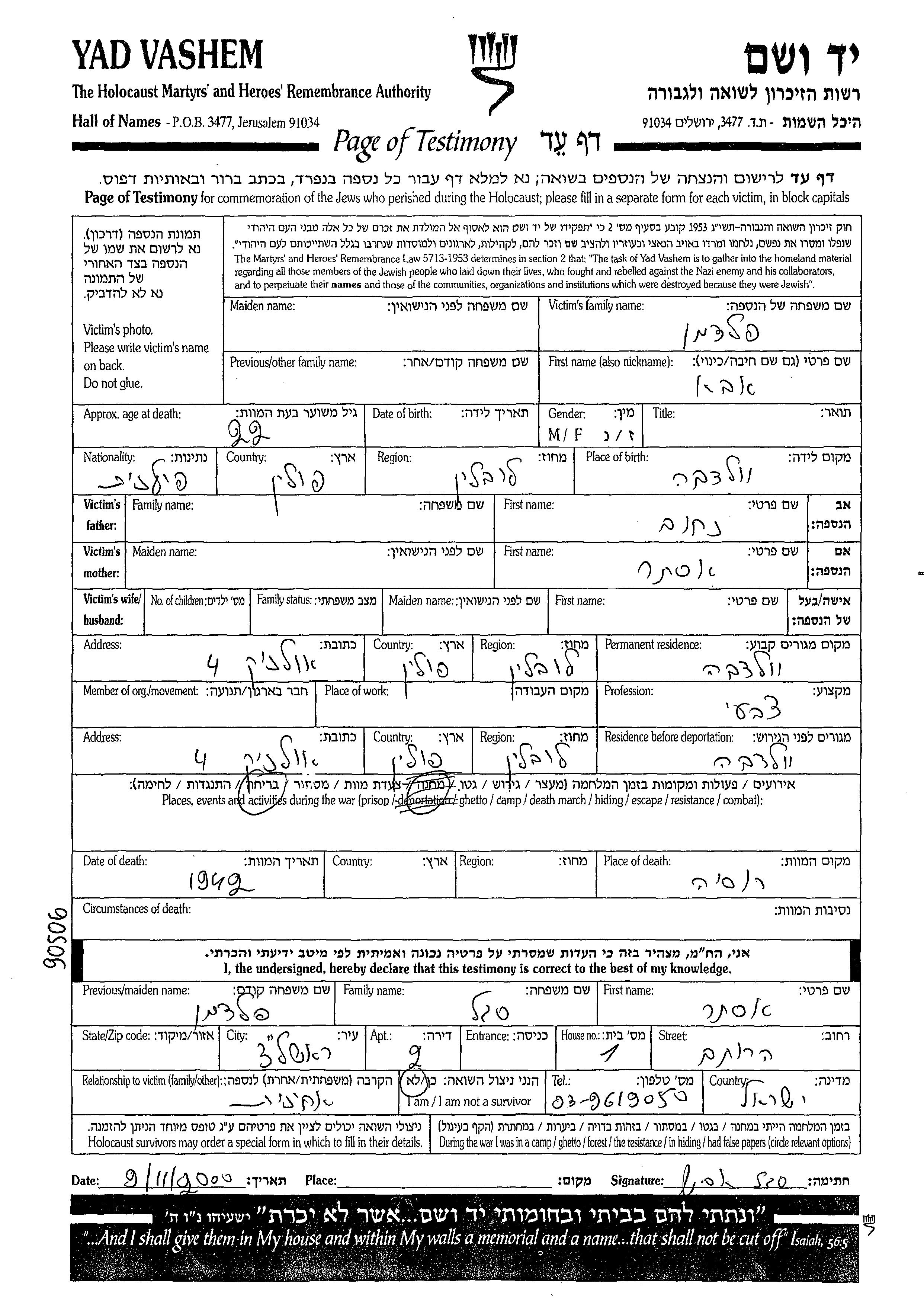 Yad Vashem - Pages of Testimony Names Memorial Collection
