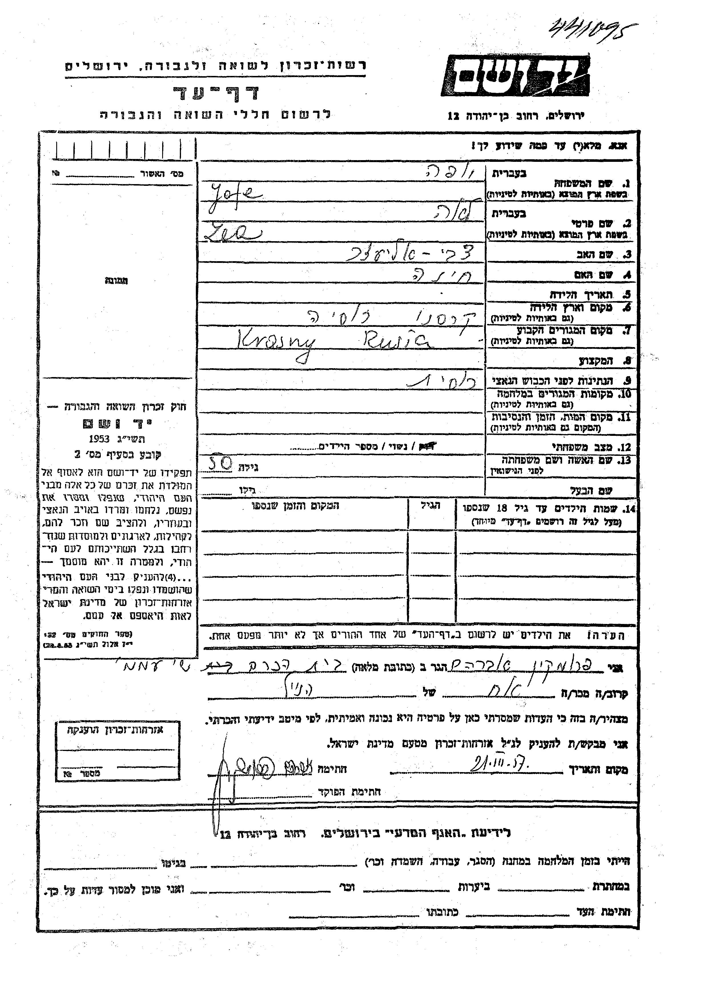 Lea Jofe nee Frumkin was born in Krasnoye, Russia (USSR) to Tzvi Eliezer and Khina. She was married. Prior to WWII she lived in Krasnoye, Russia (USSR). Lea was murdered in the Shoah.