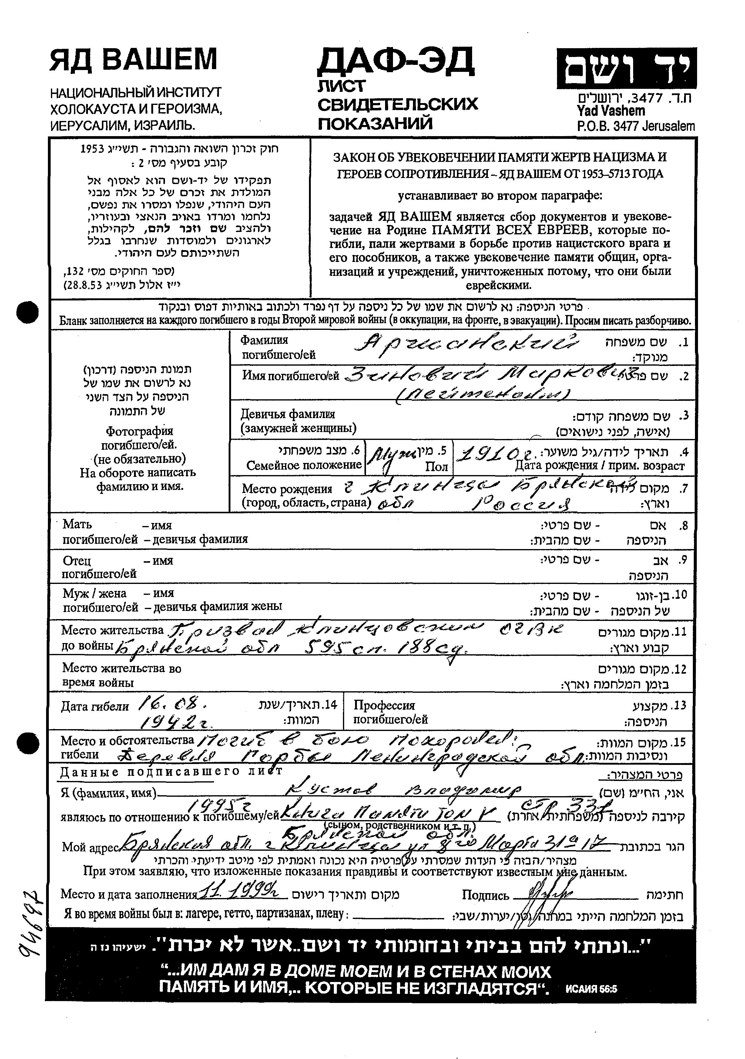 Zinovi Arshanski was born in Klintsy, Russia (USSR), 1910 to Mark. He was an officer. Prior to WWII he lived in Klintsy, Russia (USSR). During the war he was in the Soviet armed forces. Zinovi was killed in military service in WWII. Place of death: Leningrad, Russia (USSR), 1942.