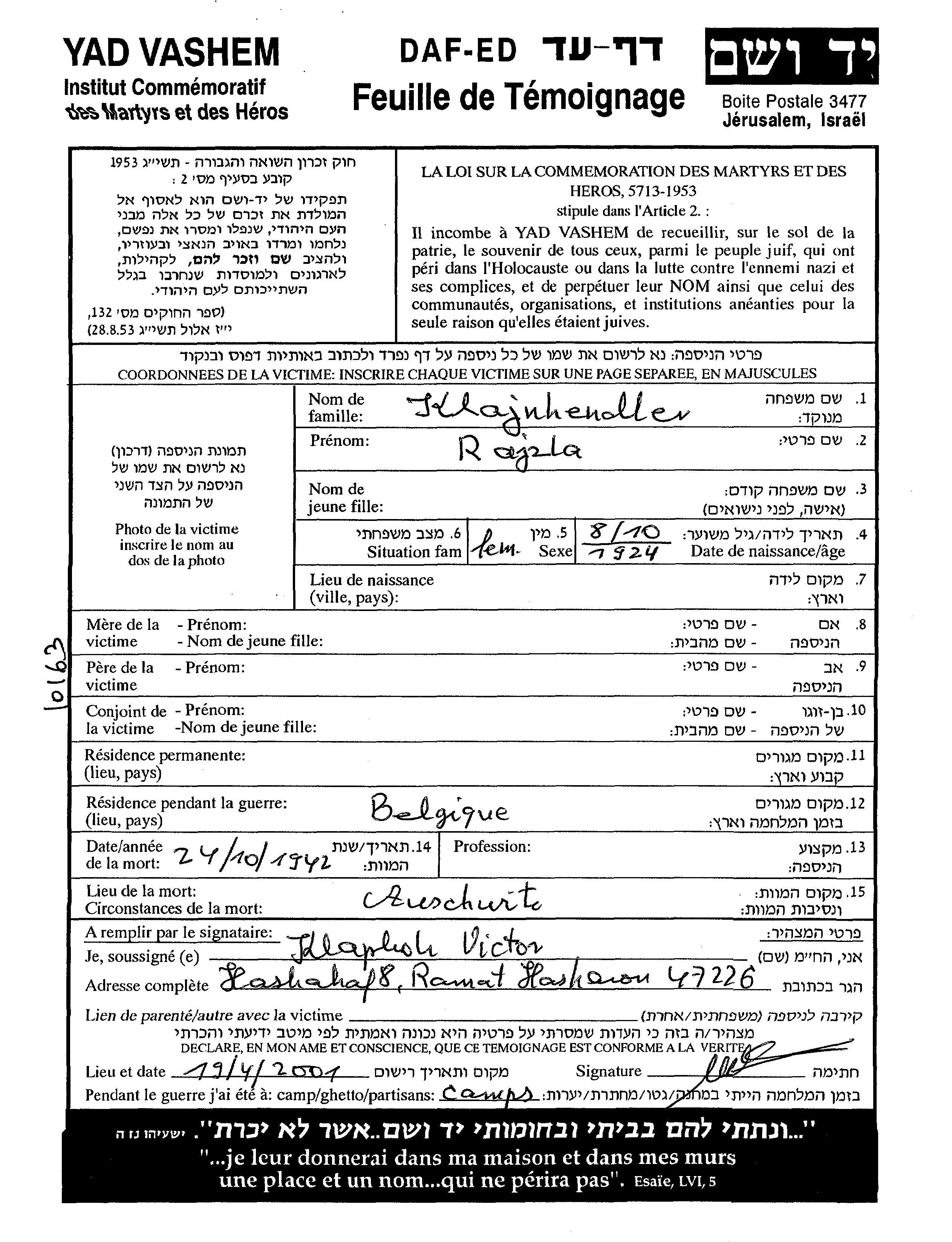 Yad Vashem - Pages of Testimony Names Memorial Collection