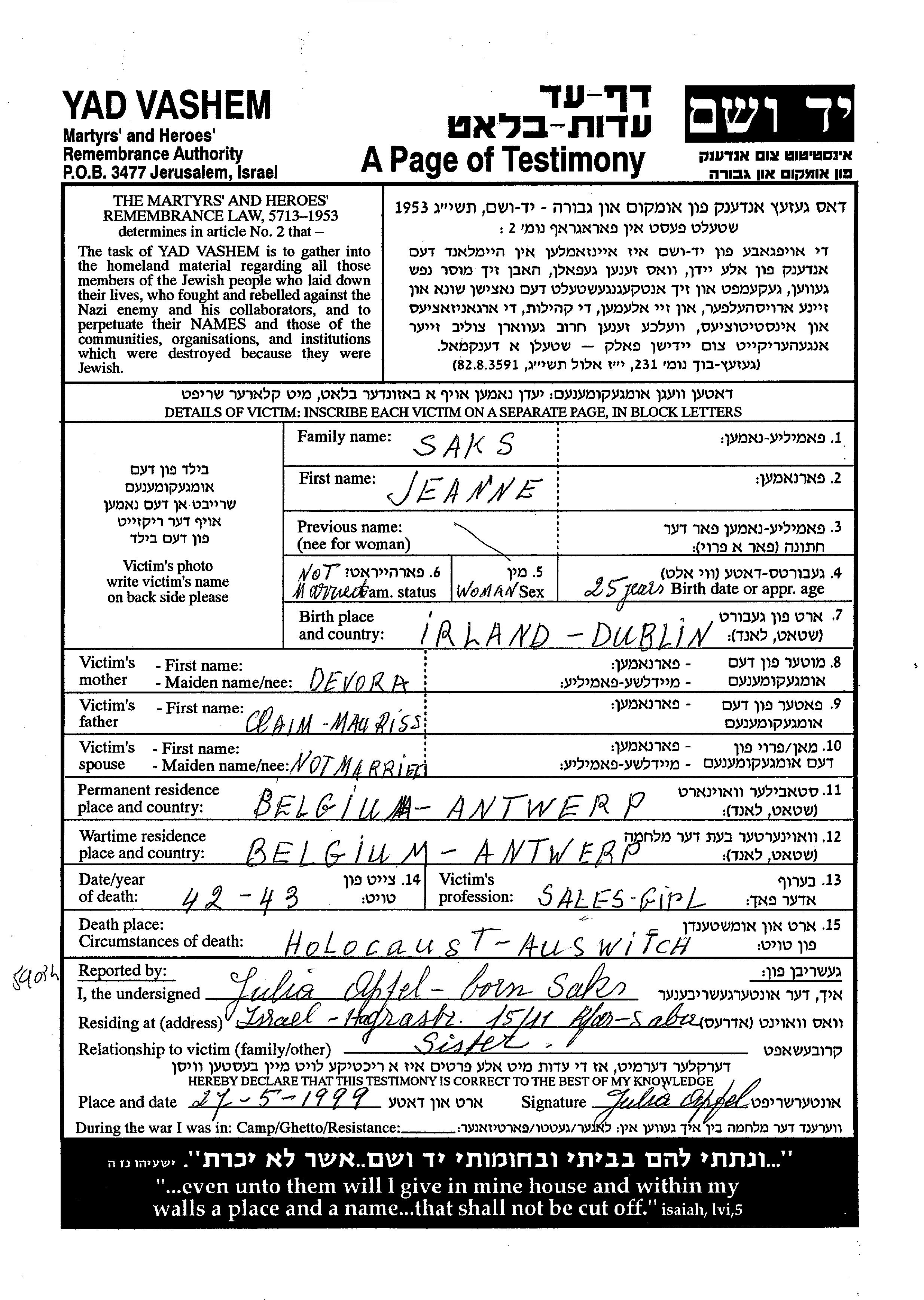 Saks Jeanne Antwerpen, Belgium Page of Testimony