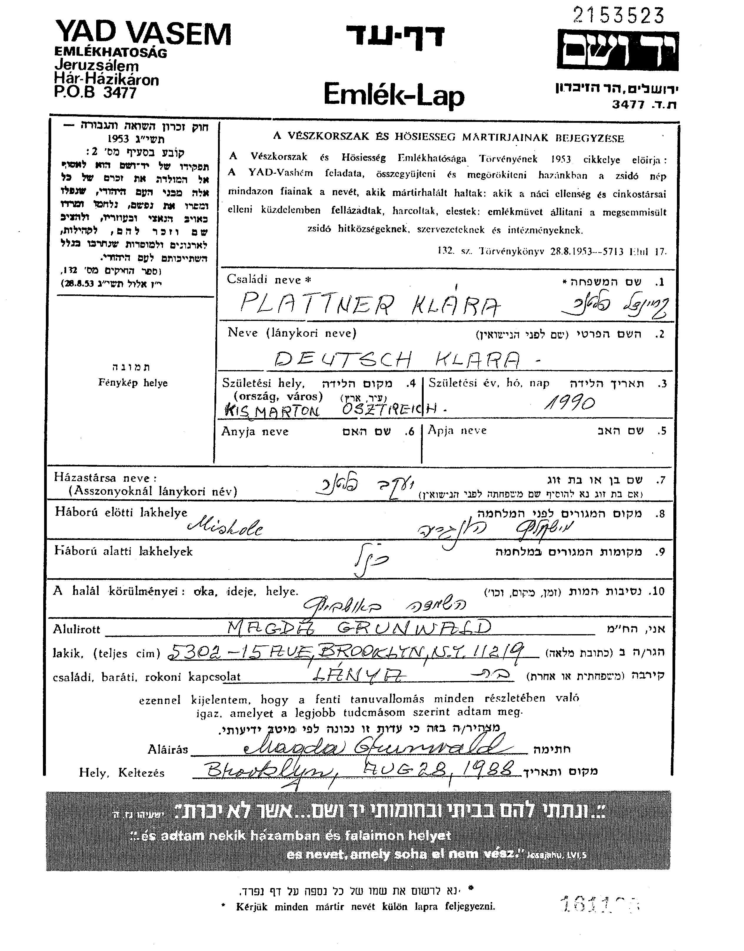 Platner | Klara | Miskolc, Hungary | Page of Testimony | |