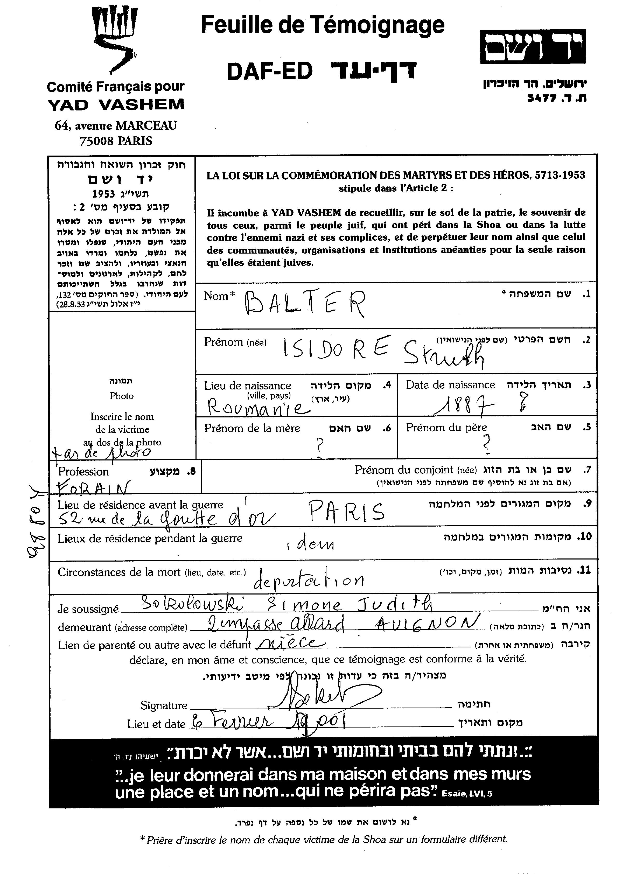 Balter Isidore Strulh 1887 Paris, France Page of Testimony