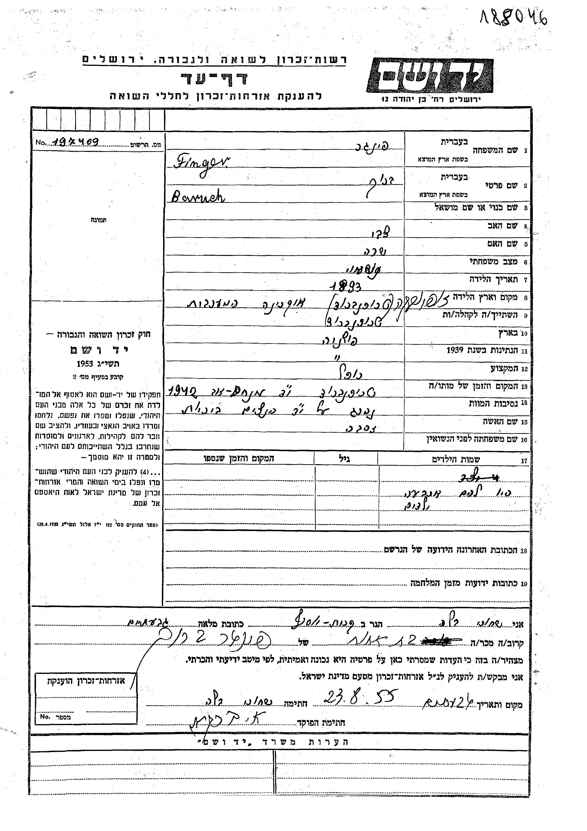 Baruch Finger was born in Zofjówka, Poland, 1893 to Tzvi and Sara. He was a peddler and married to Zahava. Baruch was murdered in the Shoah. Place of death: Trochinbrod, Poland, 1942.