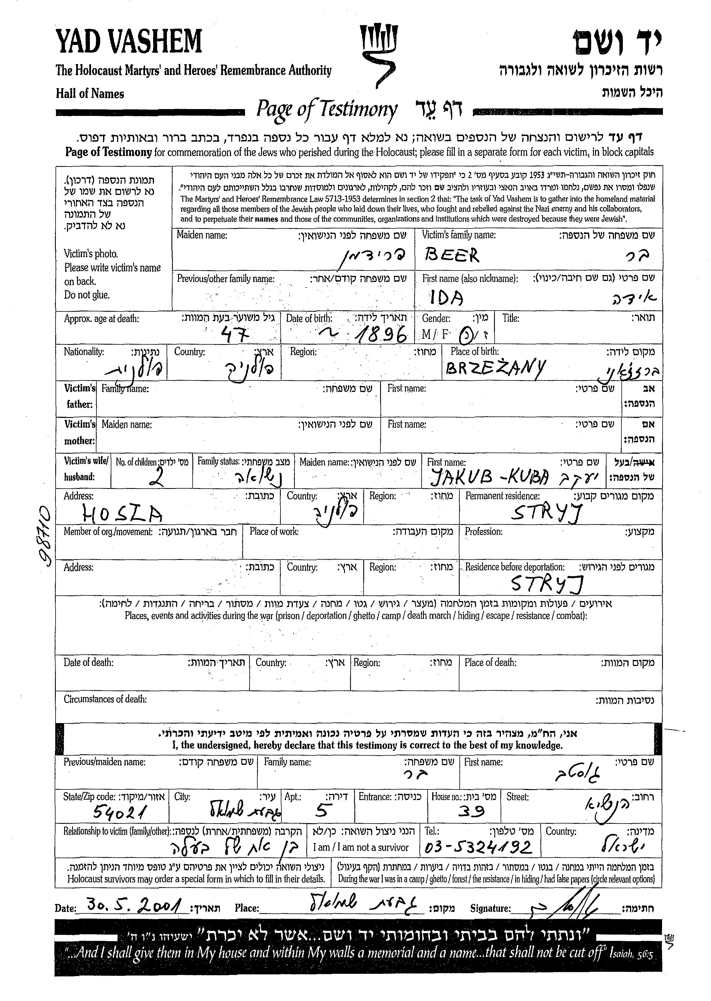 Beer Ida 1896 Stry, Poland Page of Testimony