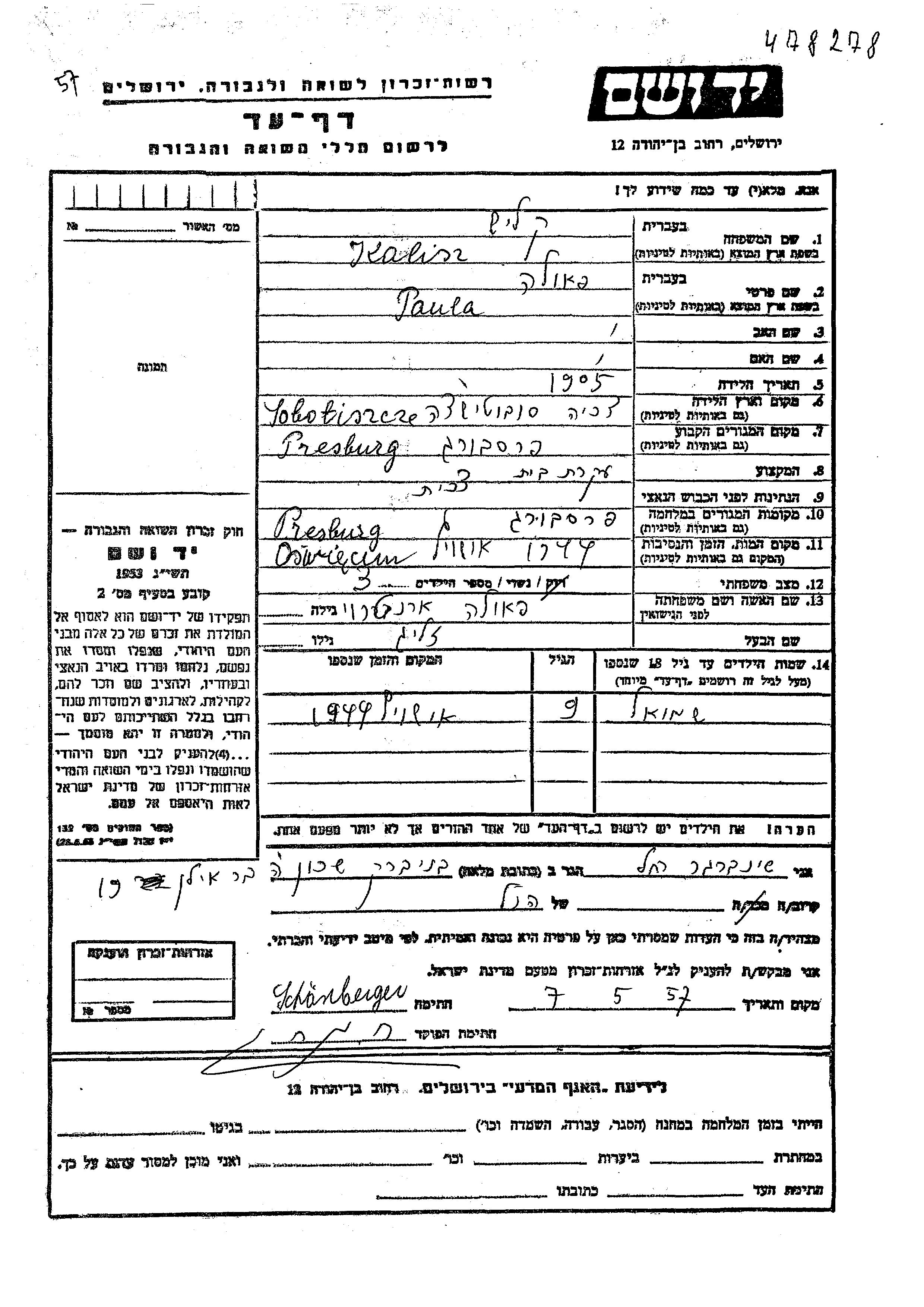 Kalisz Paula 1905 Pressburg, Czechoslovakia Page of Testimony