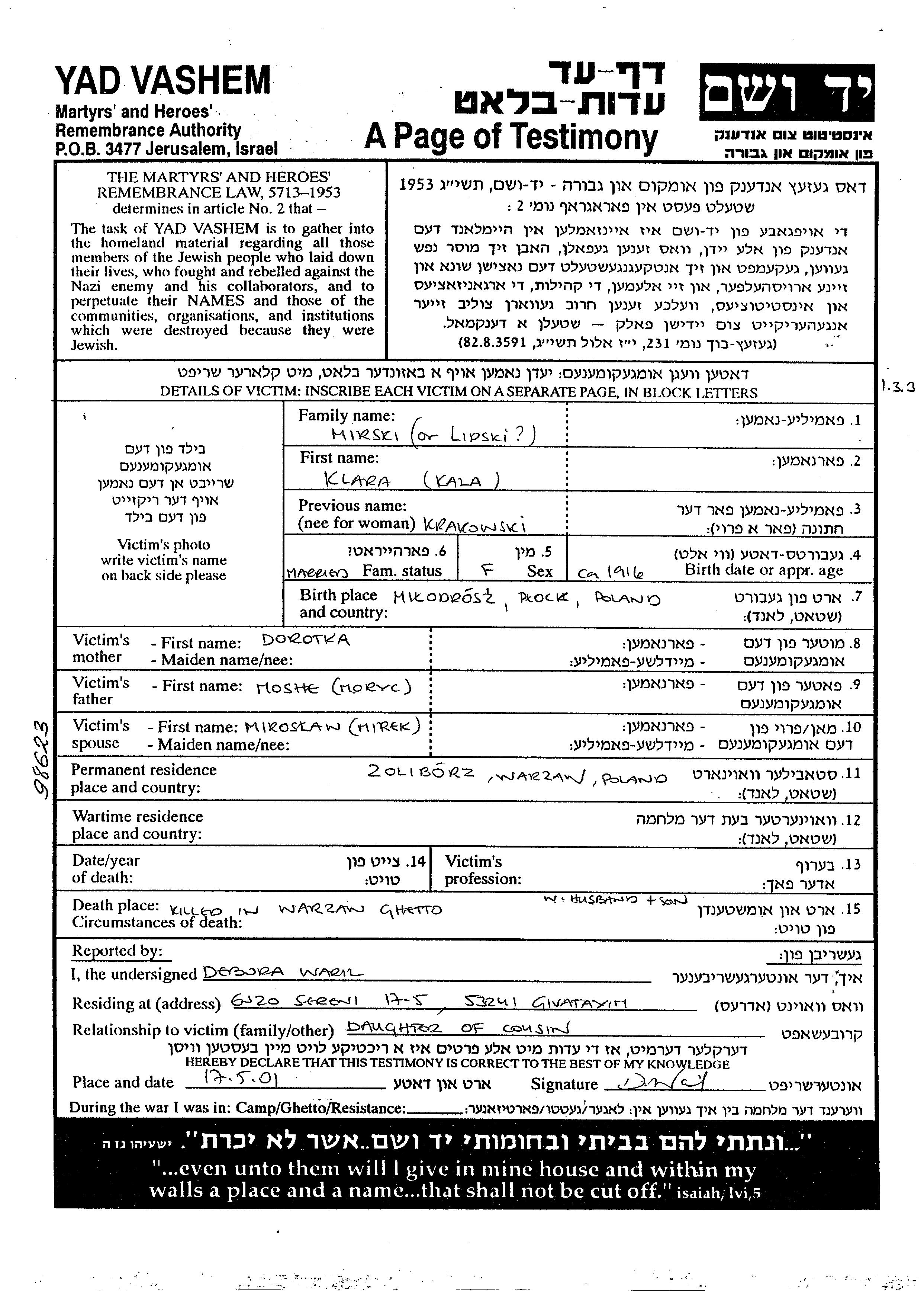 Klara Kala Mirski Lipski nee Krakowski was born in Milodroz, Poland, 1916 to Moshe Moryc and Dorotka. She was married to Miroslaw Mirek. Prior to WWII she lived in Warszawa, Poland. Klara Kala was murdered in the Shoah. Place of death: Warszawa, Poland.