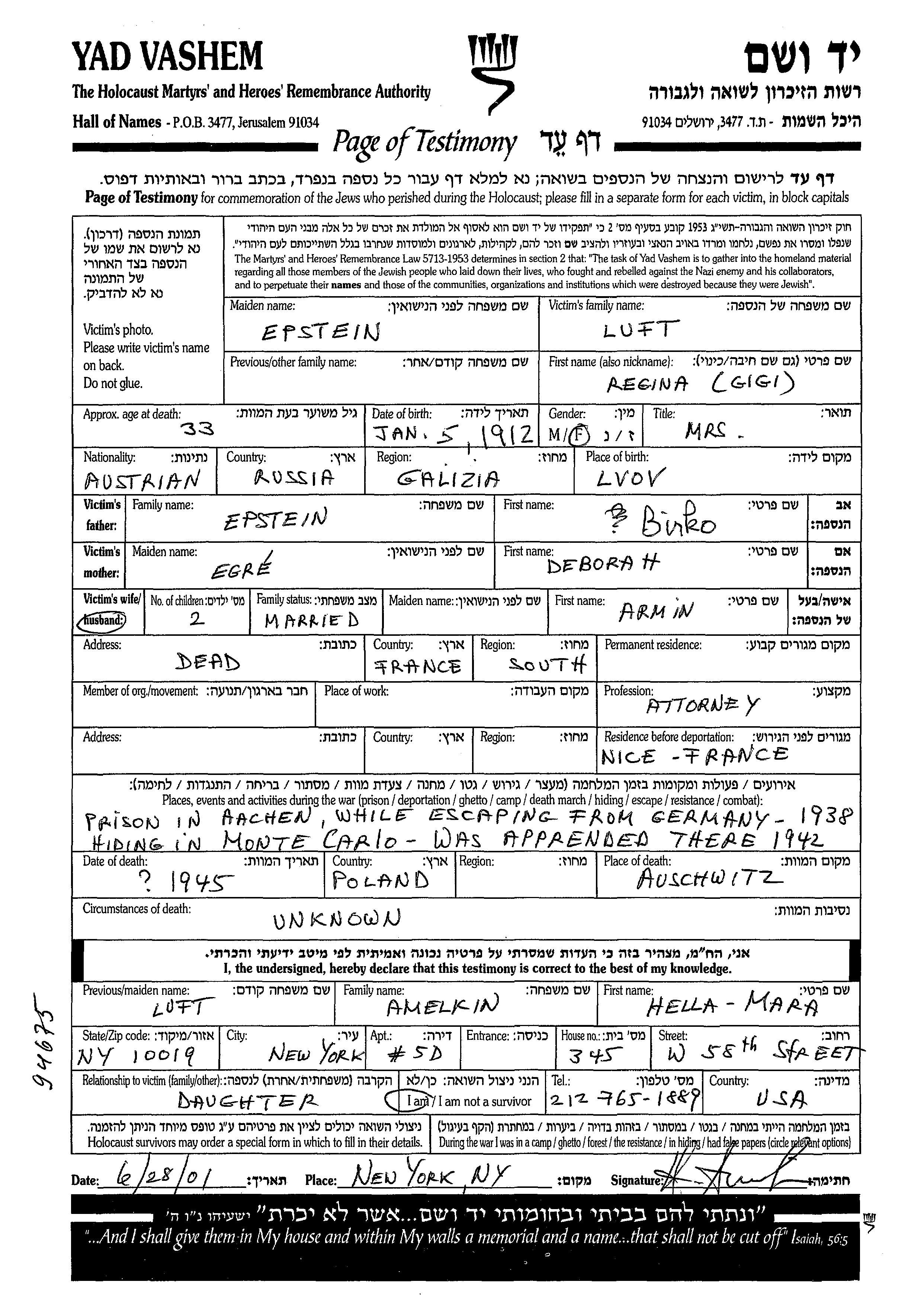 Regina Gigi Luft nee Epstein was born in Lvov, Poland, 1912 to Birko and Deborah. She was a jurist and married to Armin. Prior to WWII she lived in France. During the war she was in Nice, France. Regina Gigi was murdered in the Shoah. Place of death: Auschwitz, Poland, 1945.
